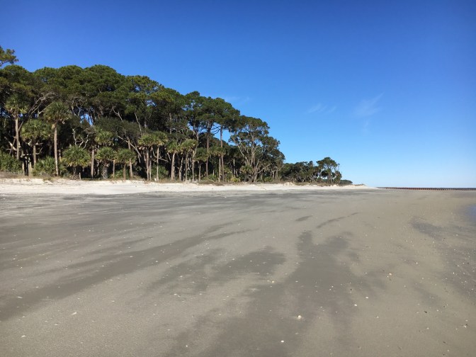 Our plan to bike to the Sea Islands, only 16 miles from our hotel, was thwarted due to cold and windy weather. Instead, we drove to Hunting Island which is almost the final island in the chain of lowcountry Sea Islands, connected by a series of bridges. It has the only beach on the East Coast where palm trees grow right down to the water’s edge. Once again, we felt lucky to have the beach all to ourselves. There are hiking paths, a lighthouse (with 167 steps), a nature preserve and pier which offers fishing opportunities and wonderful views. The entire island is a combination of swamp and marsh that gives the impression of a prehistoric jungle. It has been the movie backdrop for the Vietnam scenes in Forrest Gump and also scenes in Jungle Book and G.I. Jane.