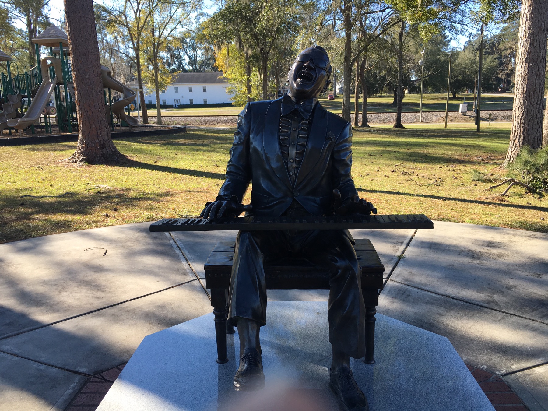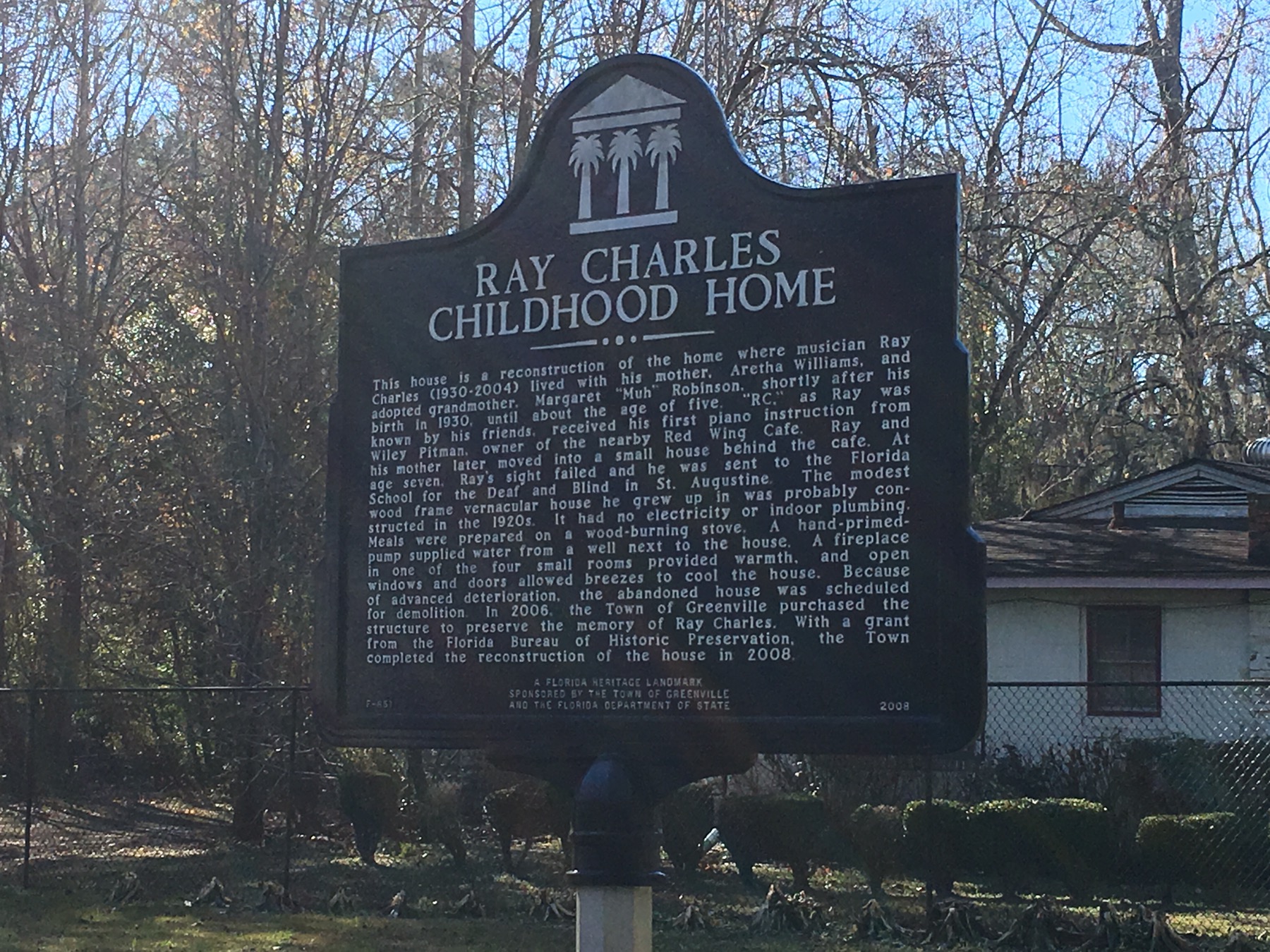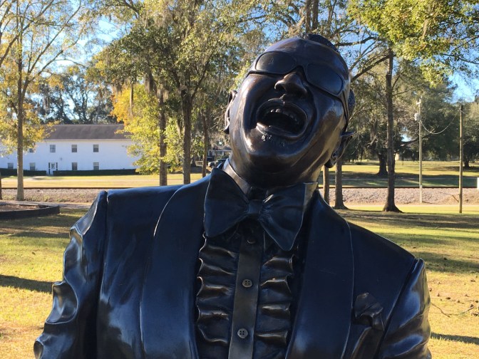 A cold Sunday morning in Tallahassee did not change our plans. A short drive to Greenville, Florida to see the childhood home of Ray Charles and a statue of the music legend in the nearby park. The childhood home of Ray Charles was scheduled to be destroyed in 2006 due to neglect and disrepair. Instead it was saved and restored by the town and funds from the state.