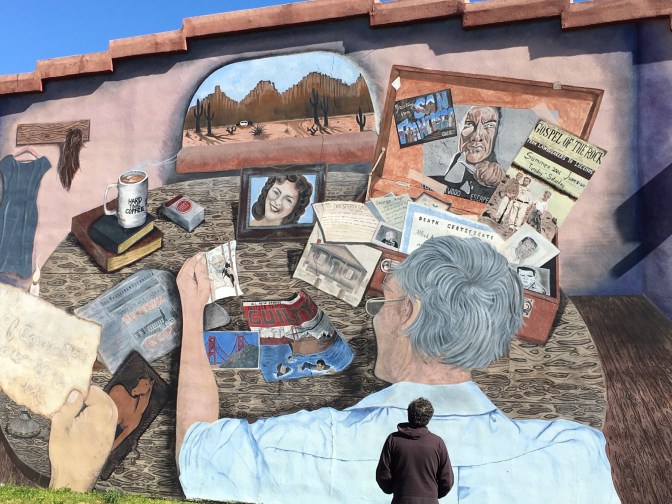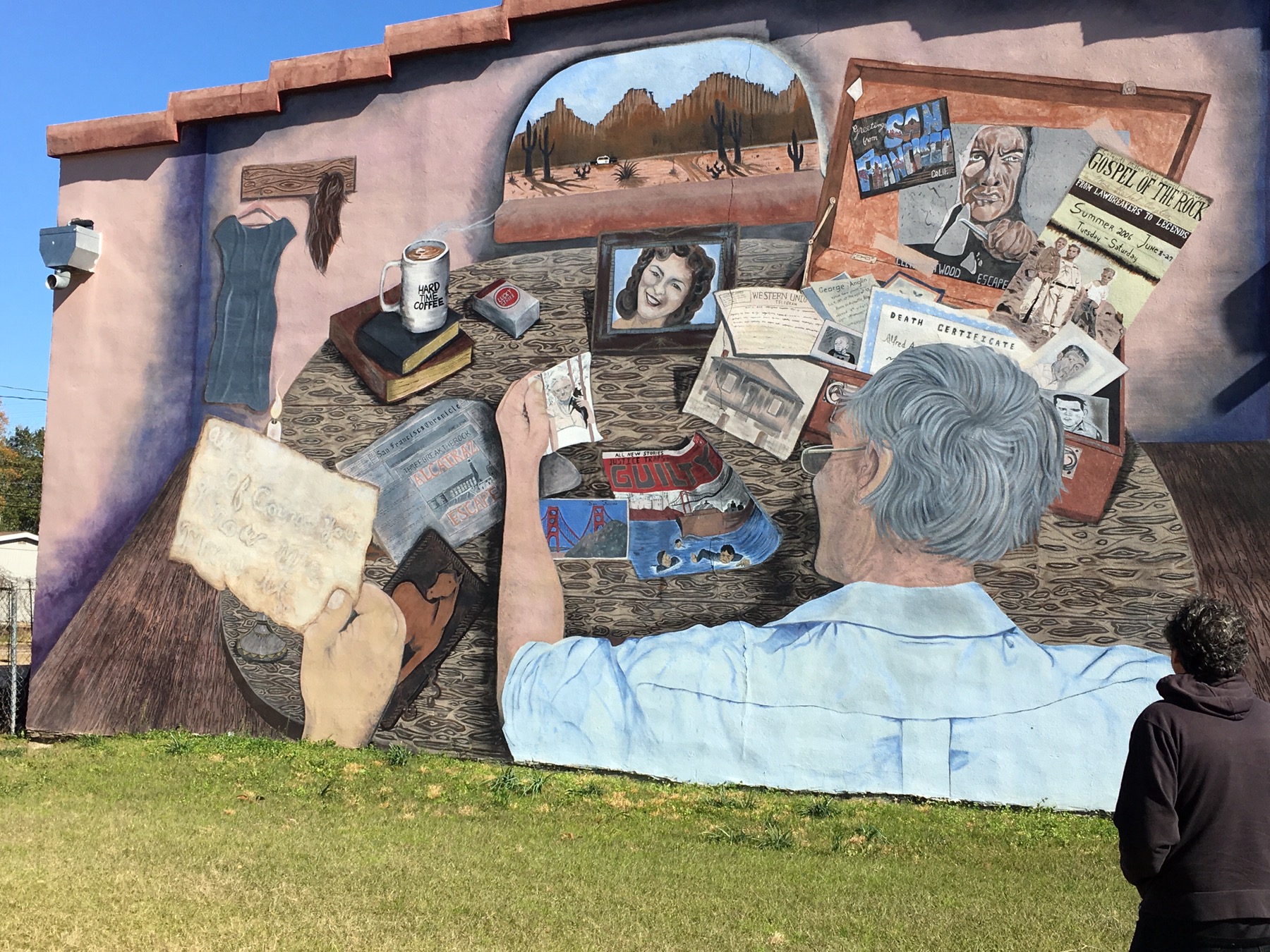 She explained that one of the murals is about the Anglin brothers who escaped and survived Alcatraz. They were local boys who during their first time in prison learned locksmith skills. When they were sent to Alcatraz, they used those skills to escape. Locals believe they made it home safely.