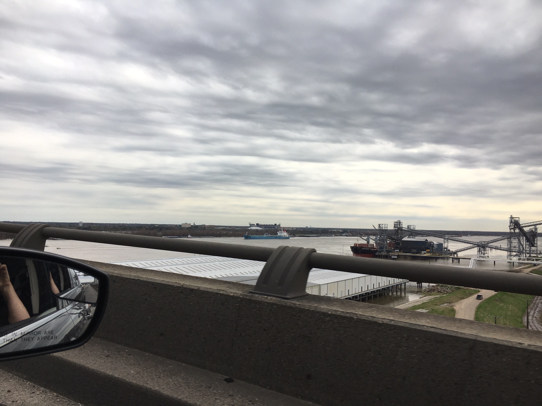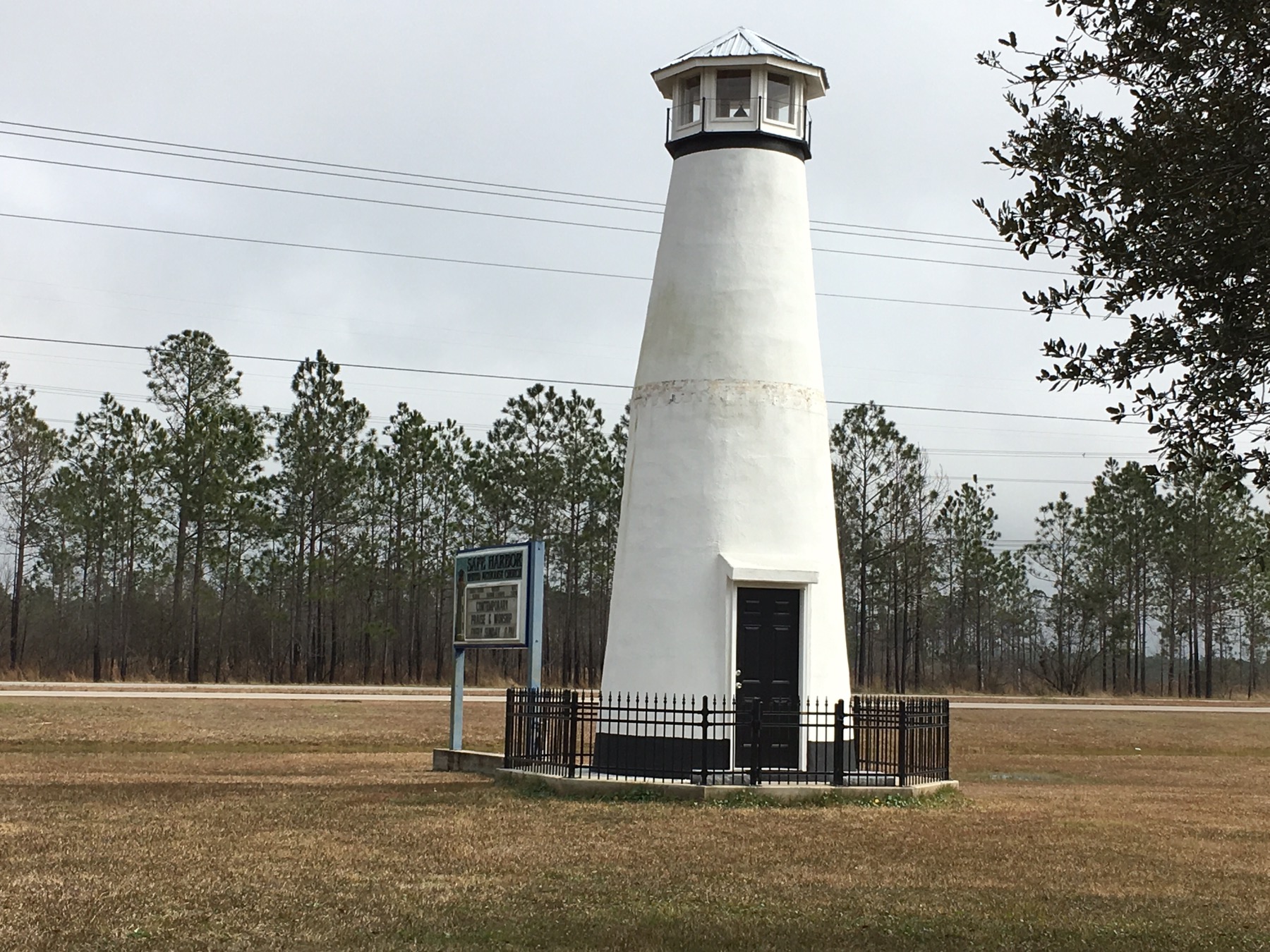 As we crossed into Mississippi, we saw the remnants of several early Mardi Gras parades on the streets of Mobile and other towns (masks and beads). We followed the rolling hills filled with farms and huge live oak trees until the fog and then storm clouds appeared. My motorcycle escort detail hustled us into Biloxi after stopping at the lighthouse in front of the Safe Harbor church.