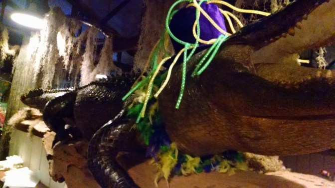 Our Cajun food tour continued into the evening where we ate listening to zydeco music and were watched over by a bedecked alligator.