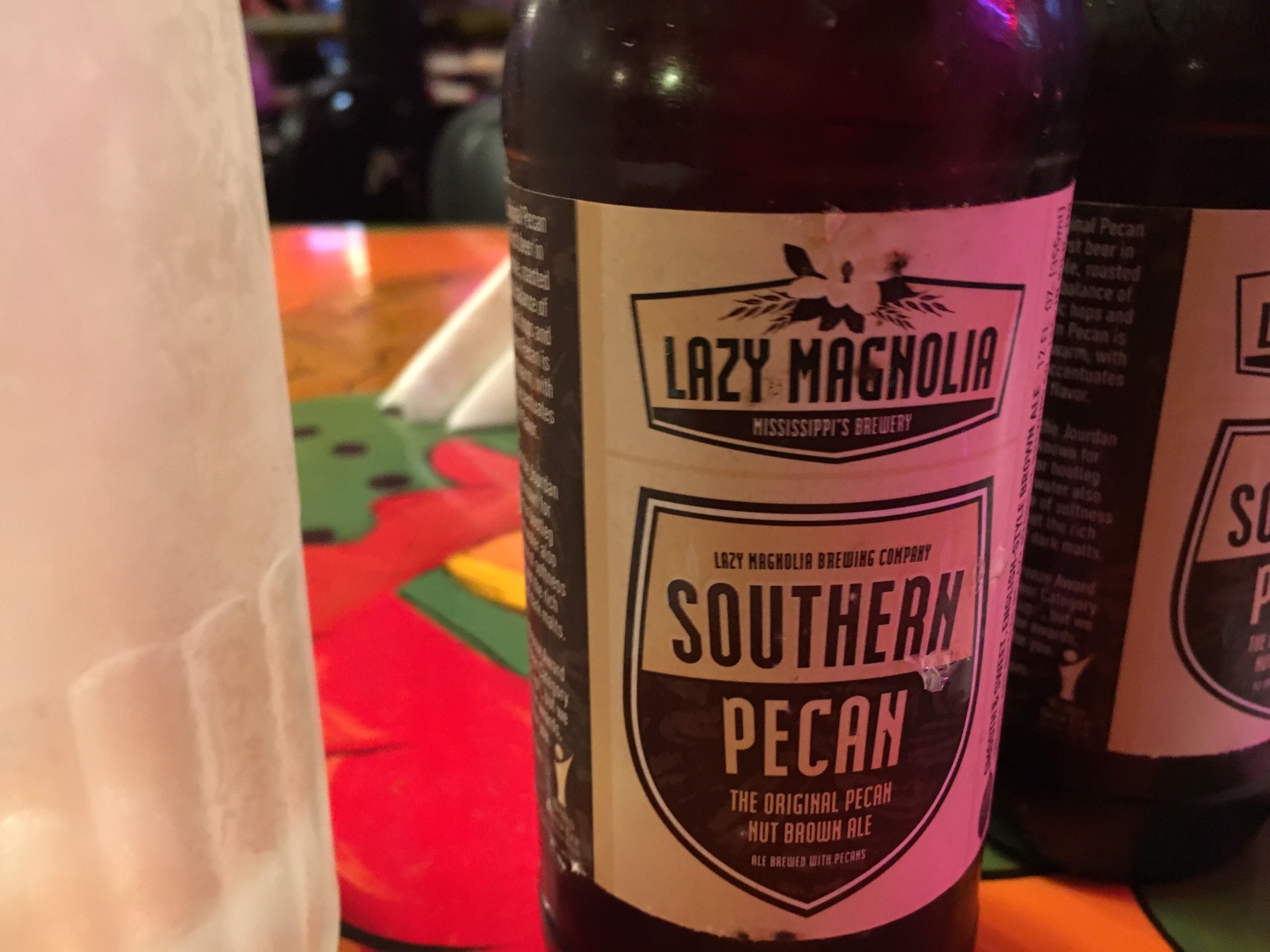 We walked along the Mighty Mississippi and explored the town a little. We booked a mansion tour for the morning and relaxed by the blooming honeysuckle vines and blossoming magnolia trees. We had yet another meal. This one at Biscuits and Blues. How could we refuse Southern Pecan Beer and crawfish nachos in Natchez?