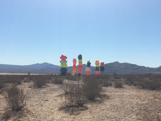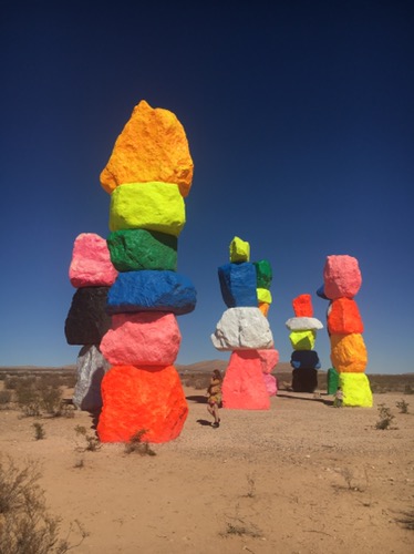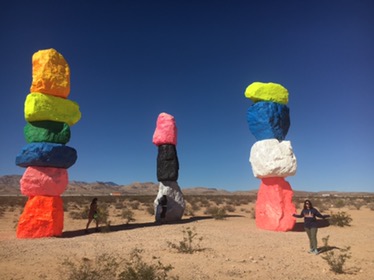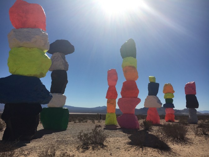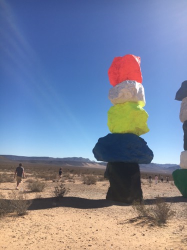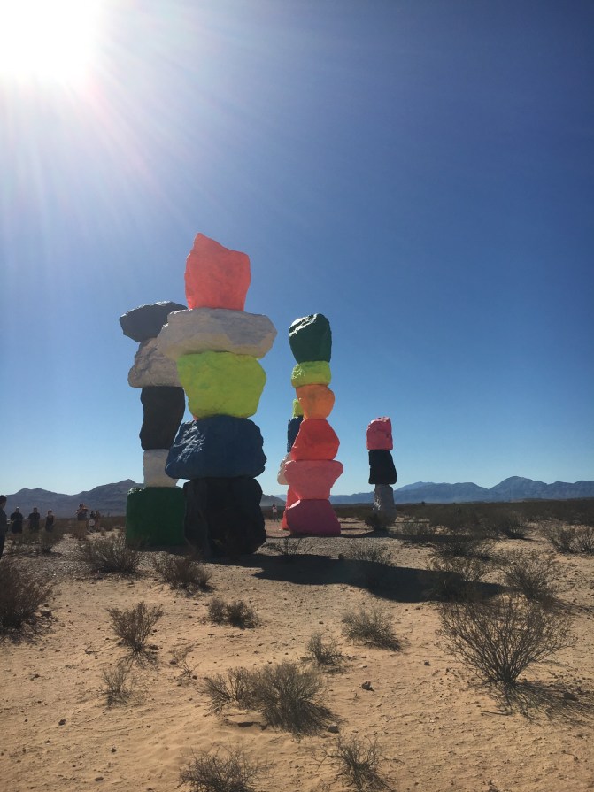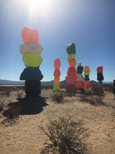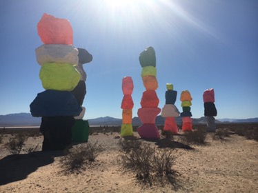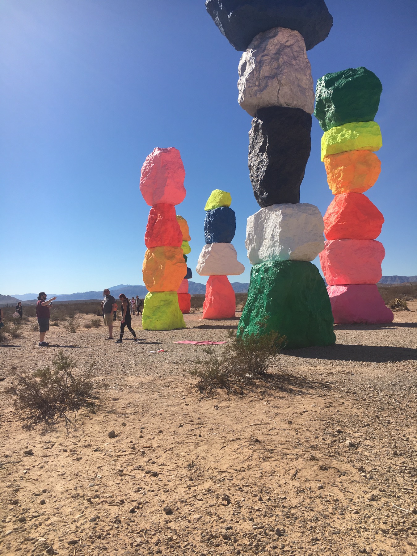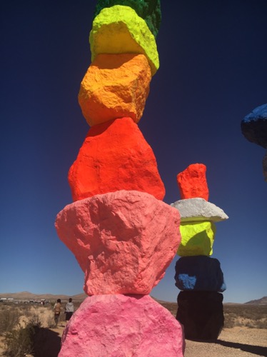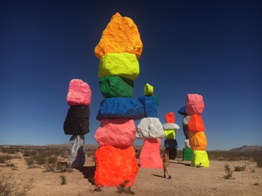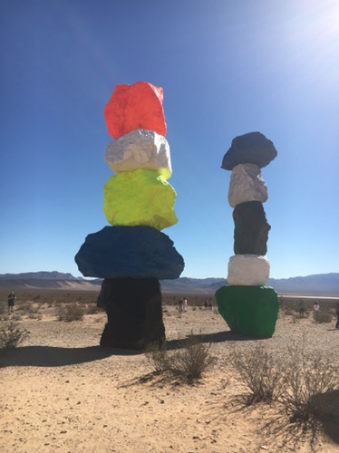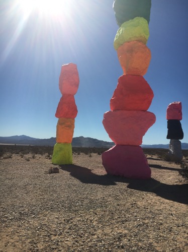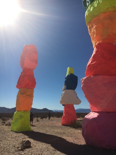 We awakened to a frosted-over car and freezing temperatures at Bryce Canyon. We opted for a road trip instead of an uncomfortable hike. Approximately 7 miles south of Las Vegas is an art installation named Seven Magic Mountains by Swiss artist Ugo Rondinone. It is a large-scale site-specific public art installation. The stacked boulders stand more than thirty feet high. It is essentially a grouping of manmade day-glo colored hoodoos! The short walk to see them has a few signs offering information about the work and the artist and also about venomous snakes.