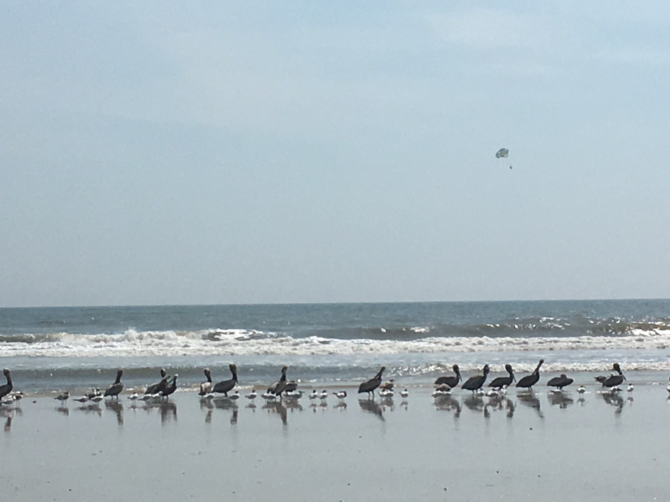 Poised pelicans, pleasant pipers and parasailling punctuates a peaceful paradise.