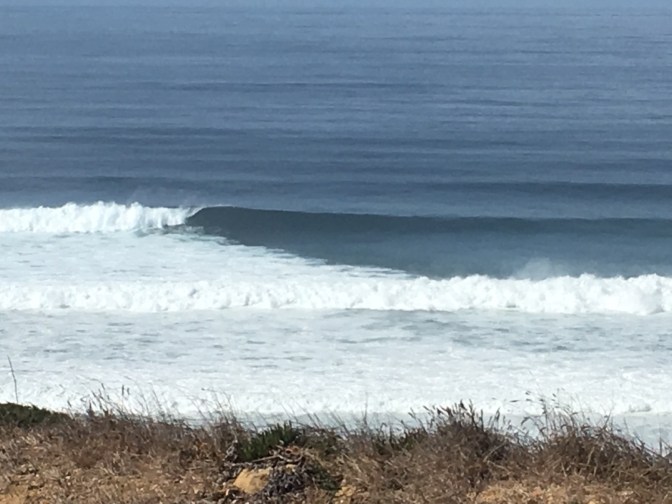 Surf school was in session but no student caught a wave while we watched. You have to zoom in pretty close to see the black dots of students trying to catch the surf.