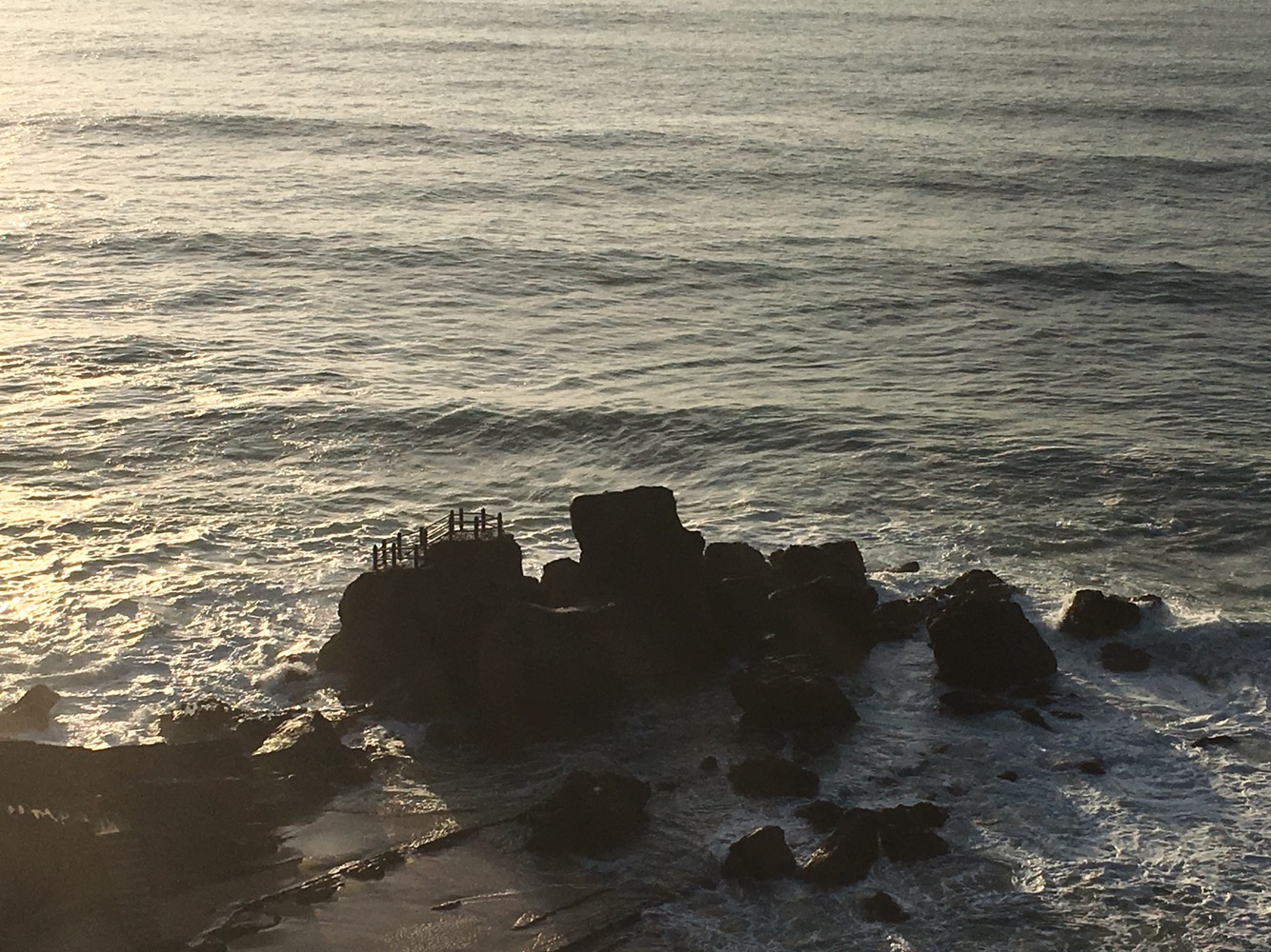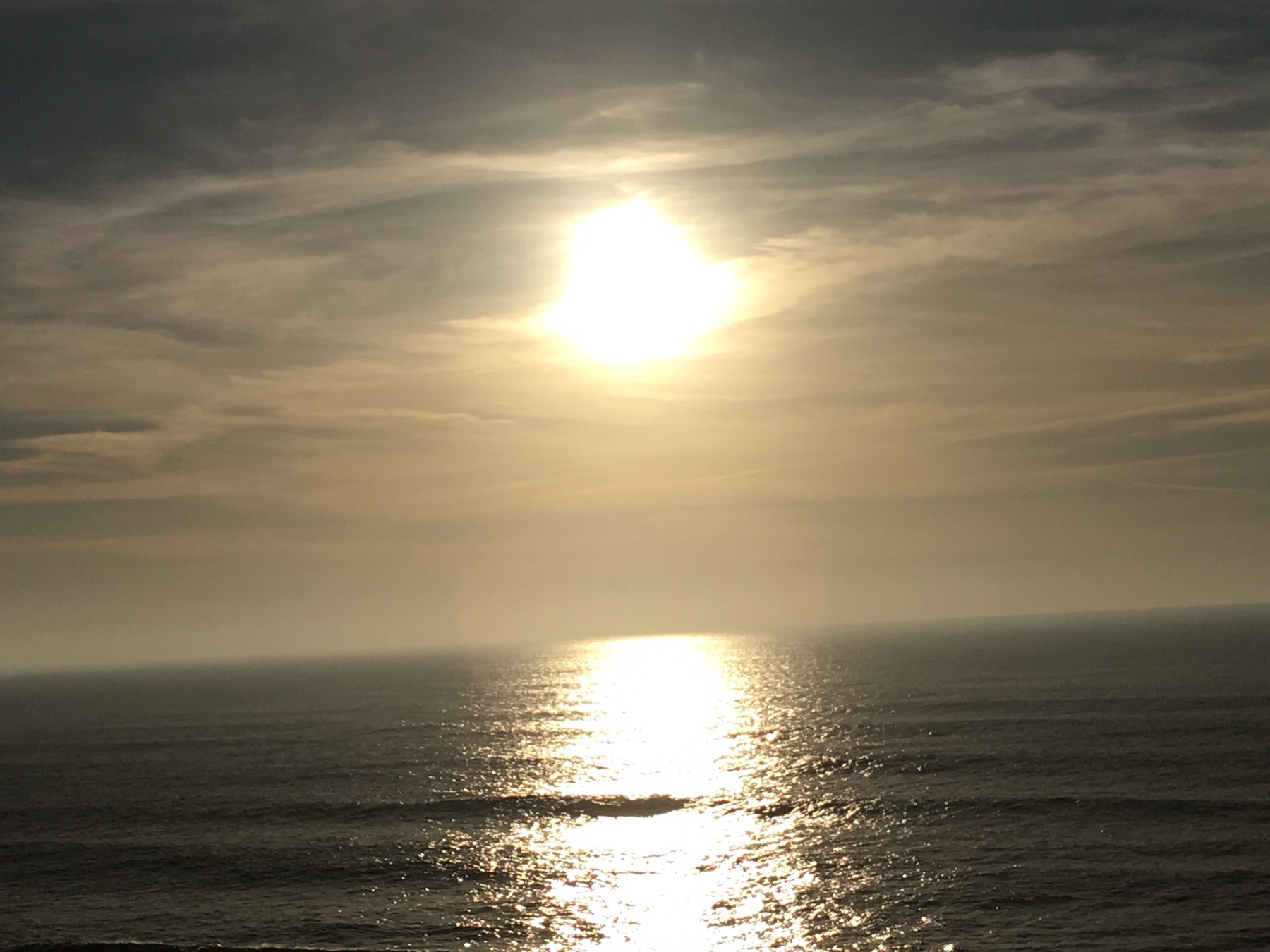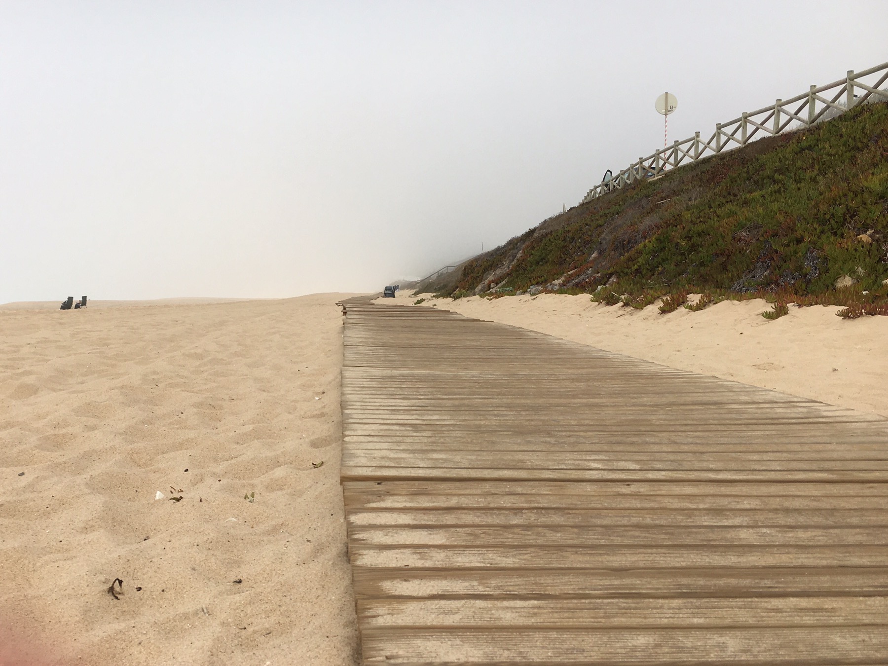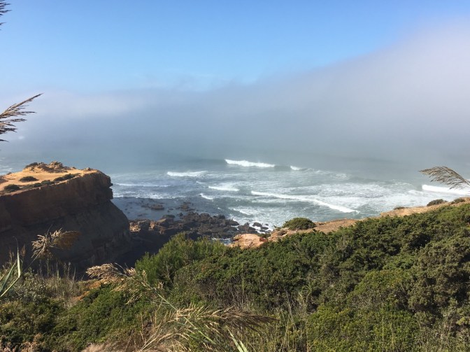 We began our walk and followed a sidewalk and then boardwalk that kept the ocean to our left. About three miles down the road, the sidewalk disappeared and there was no shoulder on a blind curve-filled road. We continued on cautiously as one more obstacle joined in, a misty fog.