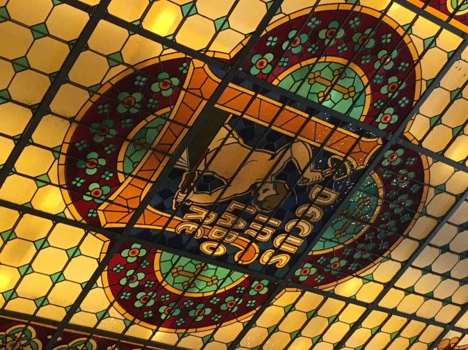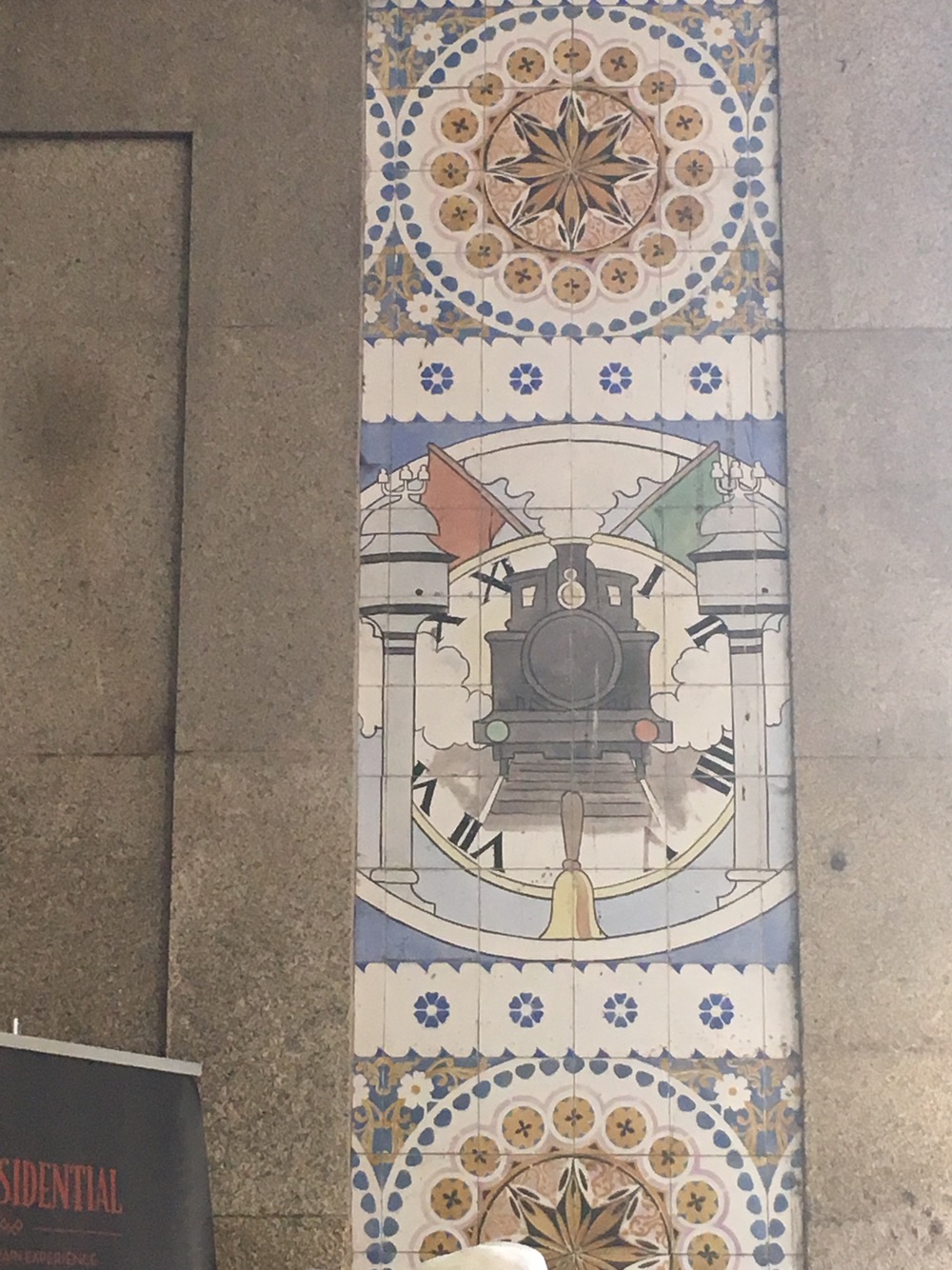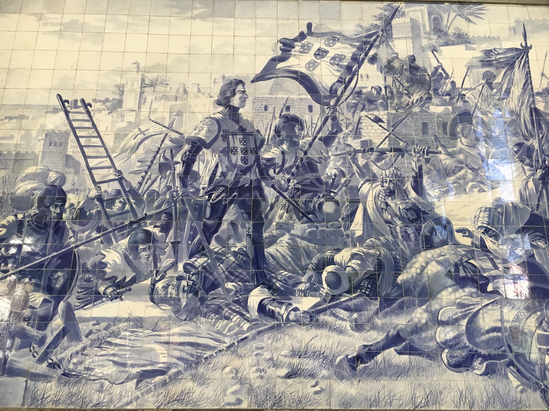 The inside of the central Sao Bento train station is filled with azjulo tile murals which depict stories about the history of Porto dating back to Roman rule.