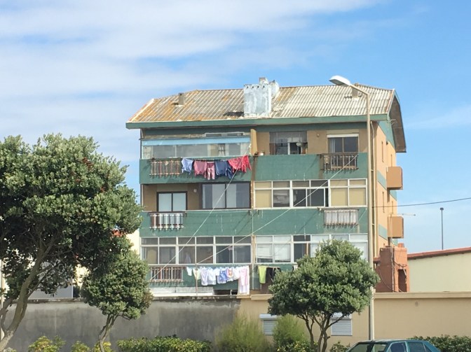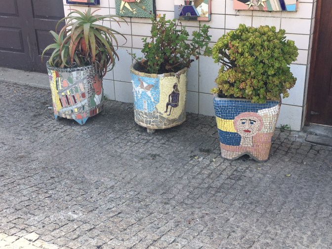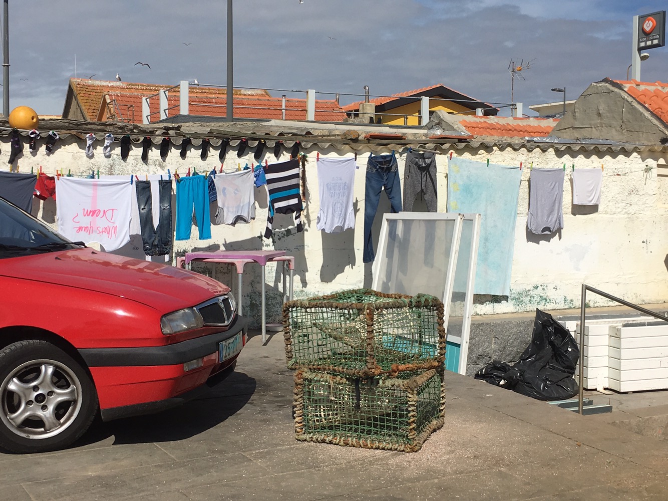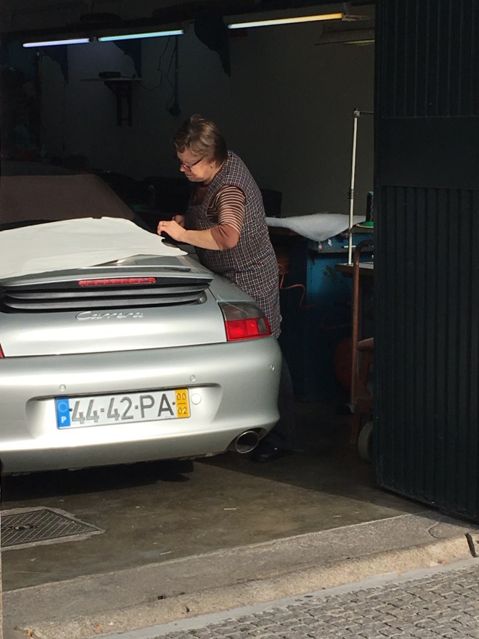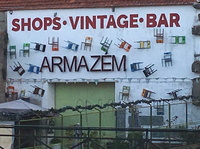 A fond farewell to Porto as we headed out along the Rio Douro towards the Atlantic coast. On the way down the hill we passed a marionette shop, a female mechanic working on a Porsche, some cool graffiti and a bunch of chairs on a wall of a bar.