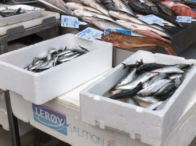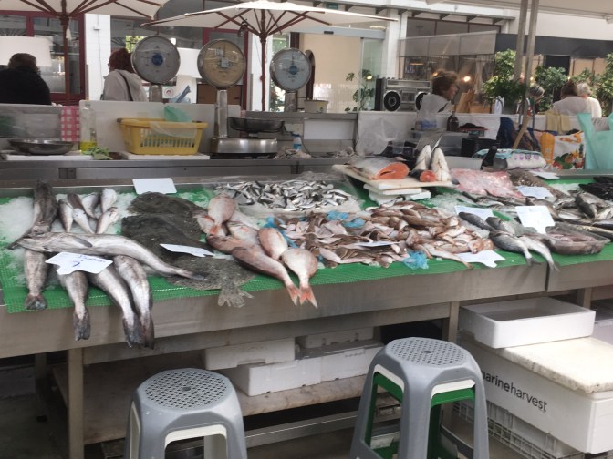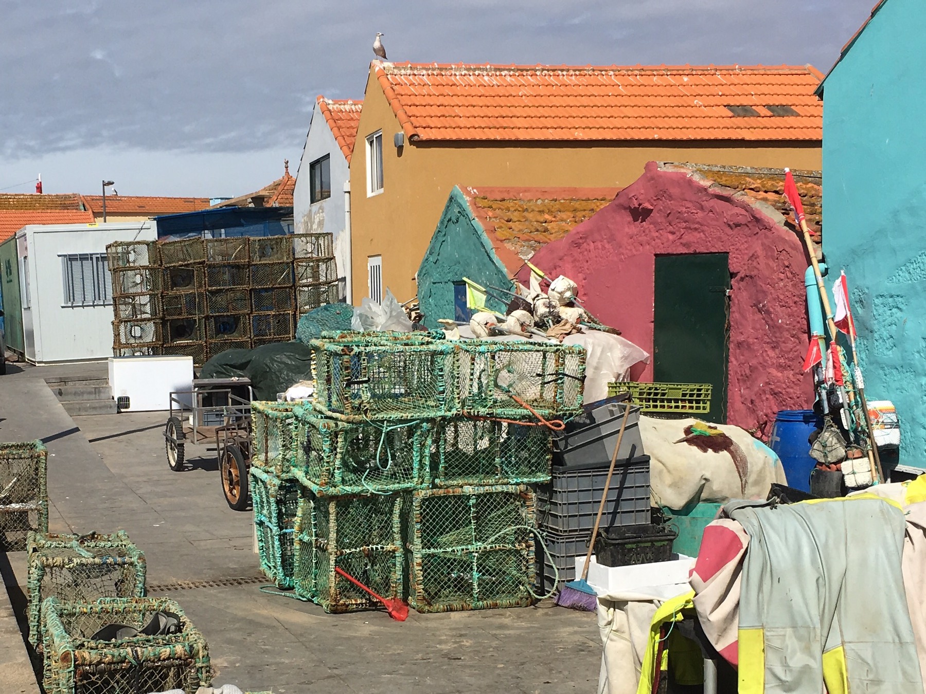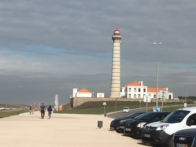 The Atlantic announced itself with strong surf, fishing and container ships, and a couple of lighthouses. We walked through the fish market in Matosinhos, then crossed a bridge and found the boardwalk and the arrows pointing us on the costal route of the Caminho.