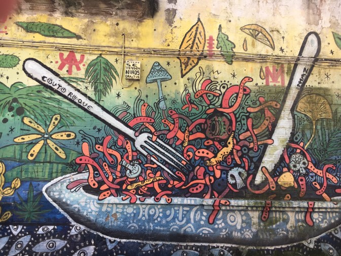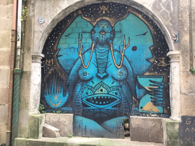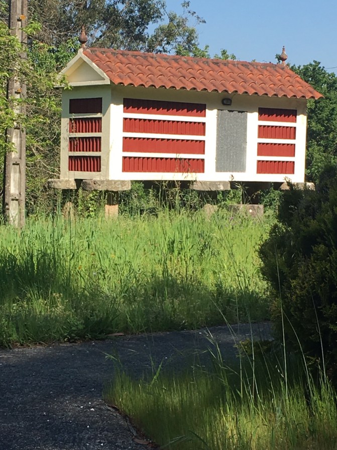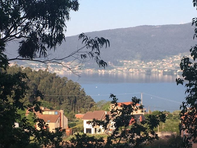 As to be expected, it was a quiet Sunday morning when we left Redondela. We passed Camino tiles along the streets and some inner city hórreo too. Crossing a not-so-busy street we entered a nature walk filled with waterfalls, vineyards and flowers.As we gained altitude we saw beautiful vistas and many pilgrims.There was a sun-bleached post with Camino shells; we added another of ours.After a challenging scramble up a stone-filled path we were rewarded with a little down hill that had another hórreo and a horse. A short walk through a small town brought us to another wonderful walk along a crystal clear river and into Pontevedra. The historic district has many cafes, lots of street art and a Parador.We stopped a a pulpería, because, why not. And yes, the grilled octopus was outstanding. Cerveza was tasty, too. We decided to treat ourselves to a stay at the Parador in Pontevedra.Our room is lovely. This Parador was the home to the Counts of Maceda. It is filled with beautiful antiques and has regal charm.
