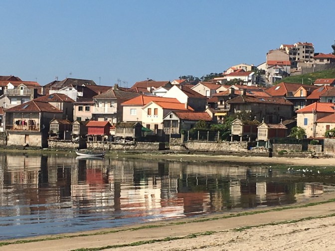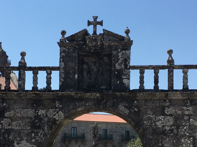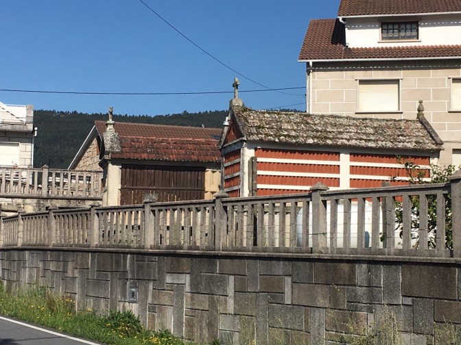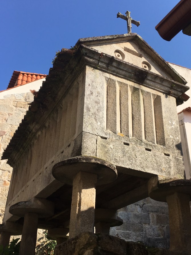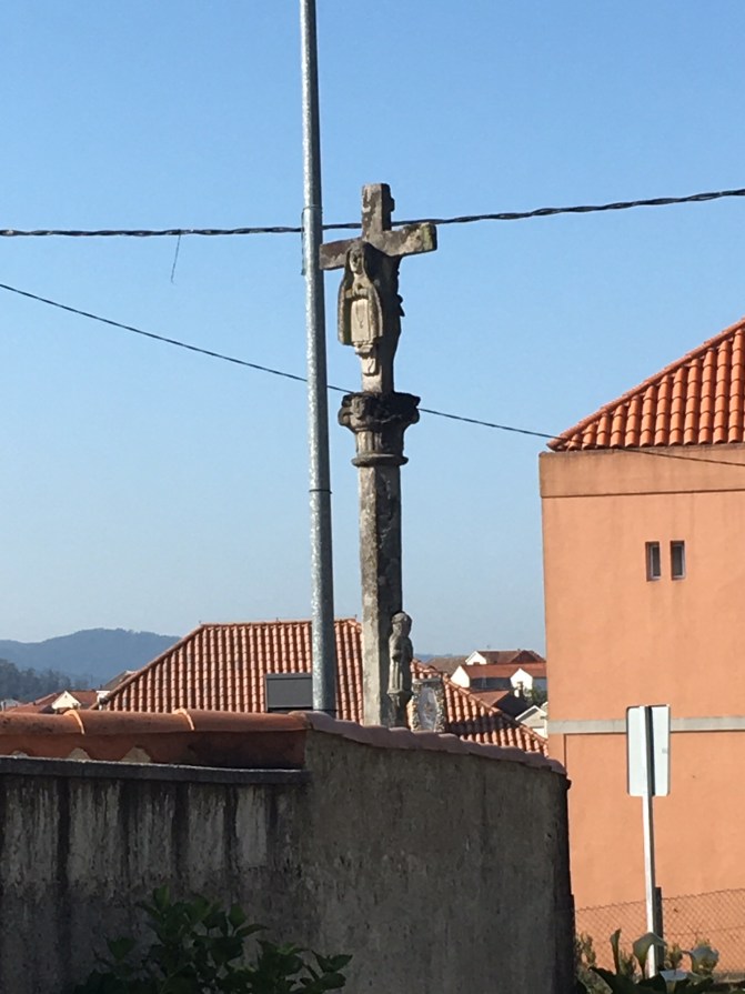 As we walked along the river, we came to the small fishing town of Combarro. There were almost as many hórreos as homes. They were all photo worthy; here are a few including those along the coast. Hórreos are the unofficial symbol of the Galicia region of Spain. Now, most are for show and no longer used to store grain. Another common sight throughout our time in Galicia has been cruceiros. These small stone crosses appear on long slender columns. They can be found in a plaza or at random points on a highway or a crossroads and sometimes just in front of a house.