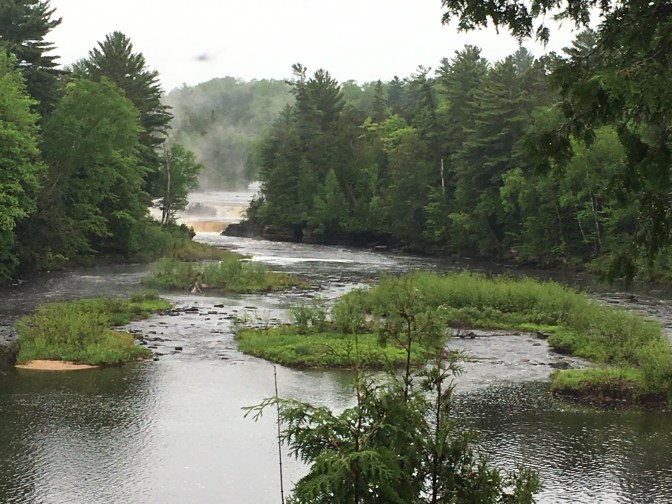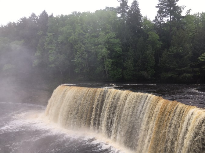 We went to Tahquamenon Falls. The name rhymes with phenomenon. Native American lore attributes the name to the water’s amber color. The falls look like they are filled with mud or rust, however, the color the result of leaching tanic acid from the cedar and hemlock swamps that feed the river. The Falls became famous from the Longfellow poem The Song of Hiawatha.
