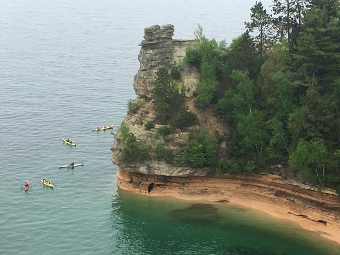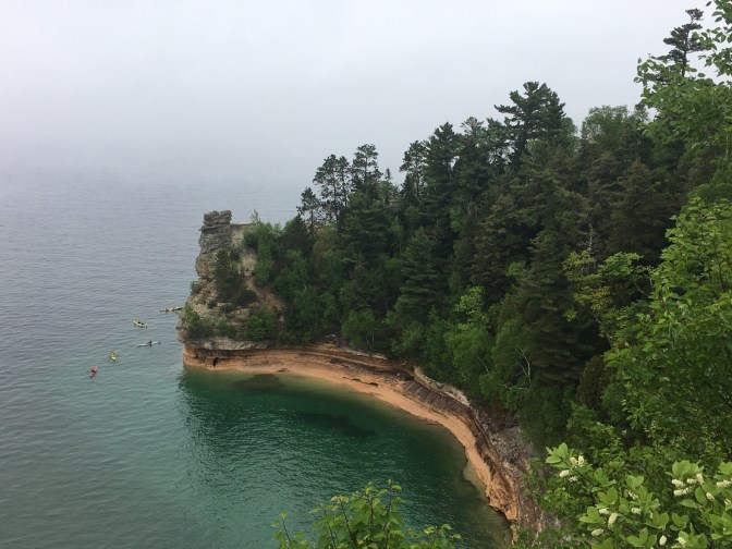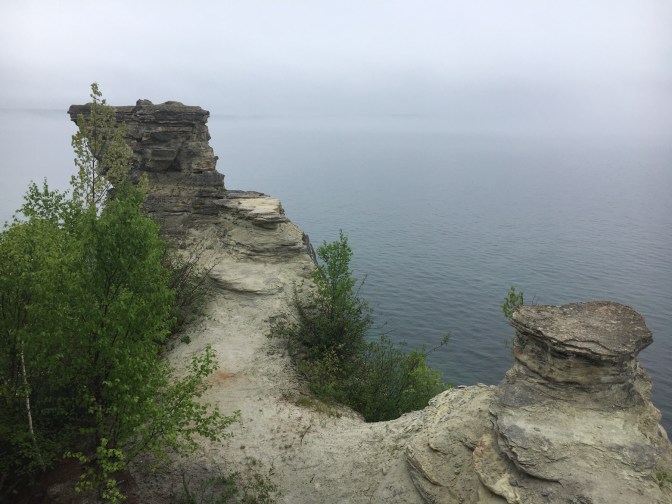 We then headed south and west along the spine of the Peninsula towards the Pictured Rock National Lakeshore. The day had turned gray and rainy which made the view of Lake Superior dark and misty. It stopped us from taking some hikes including the one out to the 1864 light house. We did see the Miner’s Castle and we will get a better view from the water tomorrow.