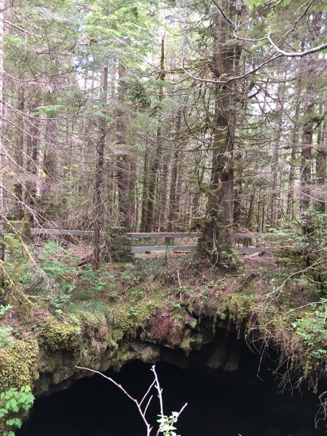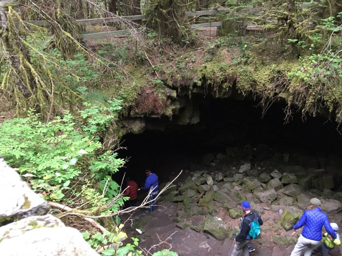 A discovery of lava tubes near Mount St. Helens was made in 1947. The Ape Cave dates back almost 2,000 years. A youth group named the St. Helens Apes were the first to explore and navigate the caves (the caves/tubes were named for them). Today, these pitch black caves can be experienced by anyone with a bright light. There are two caves to explore. The lower cave is shorter and easier (that we did). It has a few interesting features including what they call a meatball and train tracks. Unfortunately, my flash and my flashlight were unable to capture a photo of them. The tunnel descends for three quarters of a mile and gets narrow in areas. It is sort of onion shaped with textured volcanic walls, rocky ground and pointy Cathedral ceiling. The upper cave, which we opted not to navigate, is longer and has more than 25 breakdown boulder areas to cross over in the dark. (I need both hands free and lots of light to scramble over volcanic rocks). There are other hikes in the area above ground. We did walk above ground through the lush forest for a while.