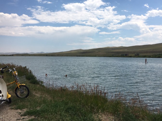 We had lunch then walked out of town and up a moderate hill to Beck Lake and Markham Reservoir. There was a paved trail around the city reservoir providing us with views of several mountain ranges, a neat mountain bike trail and of course the inviting reservoir on such a hot day.