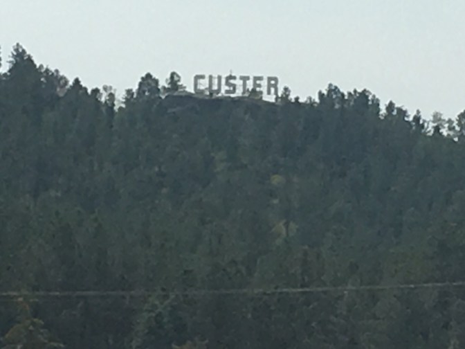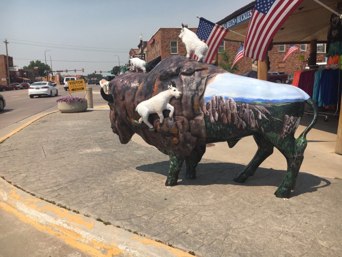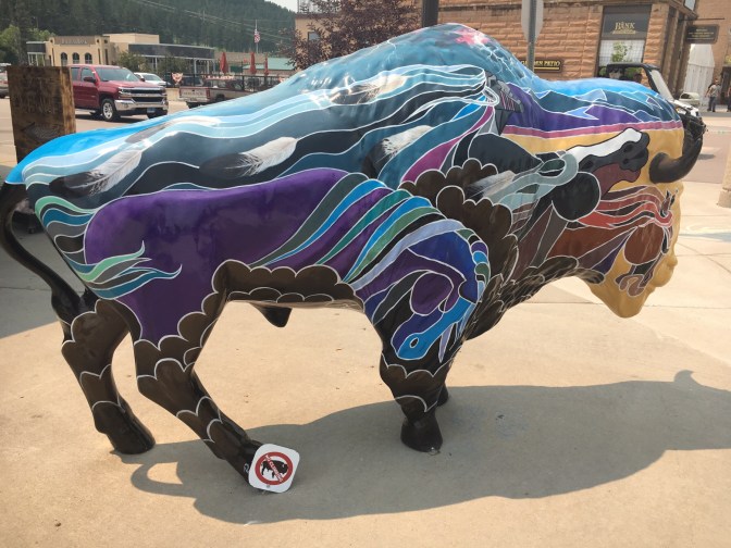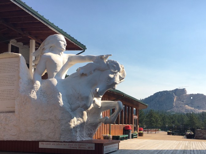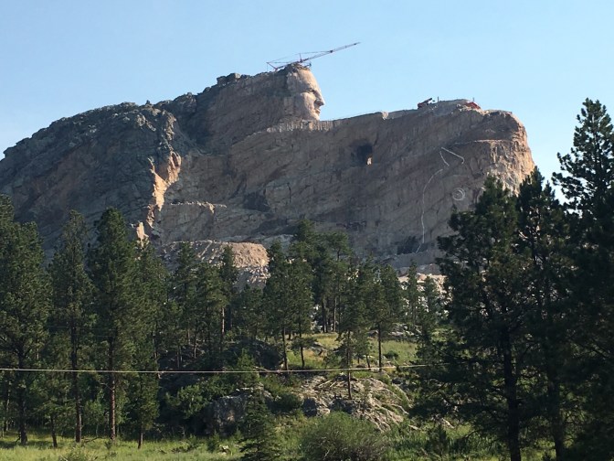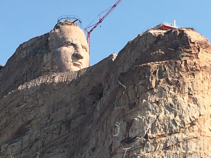 Custer, South Dakota is between two incredible mountain memorial sculptures and next to a state park in the Black Hills. The town is named for General Custer’s gold find in 1870, not for his battles in Montana. We chose to make this interesting spot a base for a few days. Custer is small with western ware and cowboy fare. There is a giant sign in the ponderosa pine hillside above the town a la the HOLLYWOOD sign, a few rose quartz quarries and life-sized, artist-painted fiberglass bison on most corners. You know you are out of the big city when you park next to a pickup filled with skulls, antlers, and skulls with antlers (antlers are shed many times during an elk or mule-deers life). Less than a ten minute drive from the center of town is the Crazy Horse Memorial. This is not a government project, and there is no corporate funding. It is a private venture. It is the world’s largest mountain carving in progress.