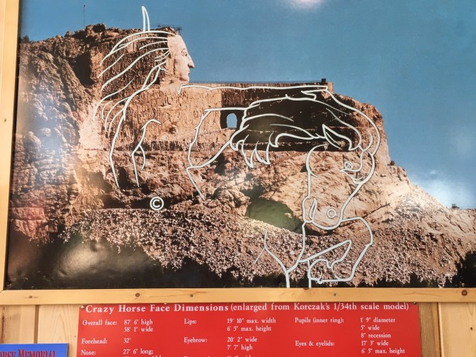 Henry Standing Bear, Chief of the Lakota asked sculptor Korezak Ziolkowski in 1939 to create a memorial in response to Mt. Rushmore “to let the white man know that the red man has great heroes too.” Ziolkowski accepted the project and found a way to get the land (a US Forest Service land swap) and begin this dream project. A carving of Crazy Horse on his horse pointing towards his lands was the final goal. The first blast of rock was in June of 1948. Ziolkowski’s wife Ruth and their ten children all assisted in this dream. 70 years later, the dream continues. The face is finished and work is constant on the arm, hair, and horse. There is a third generation of Ziolkowski working on the project. Also included in this project are a visitor center, a museum, and a Native American College with medical training center. The scale of the sculpture is enormous. The four heads of the presidents on Mount Rushmore could fit inside the head of Crazy Horse.