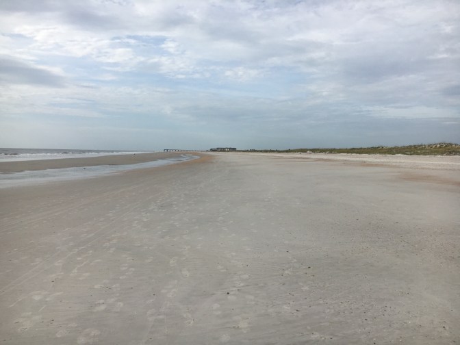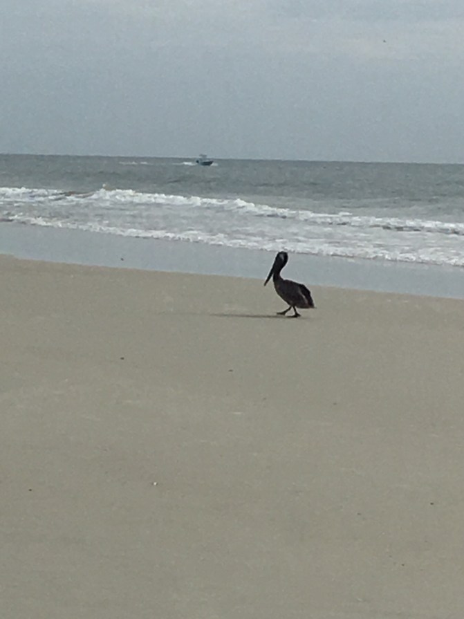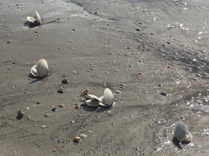 Hot and humid with afternoon thunderstorms describes most of Florida in the summer. A beautiful and mostly empty beach make it a nice way to spend our time. Today we came across several sets of turtle tracks; their nests already marked by park rangers, a pelican hanging out and many open clam shells by the waters edge.