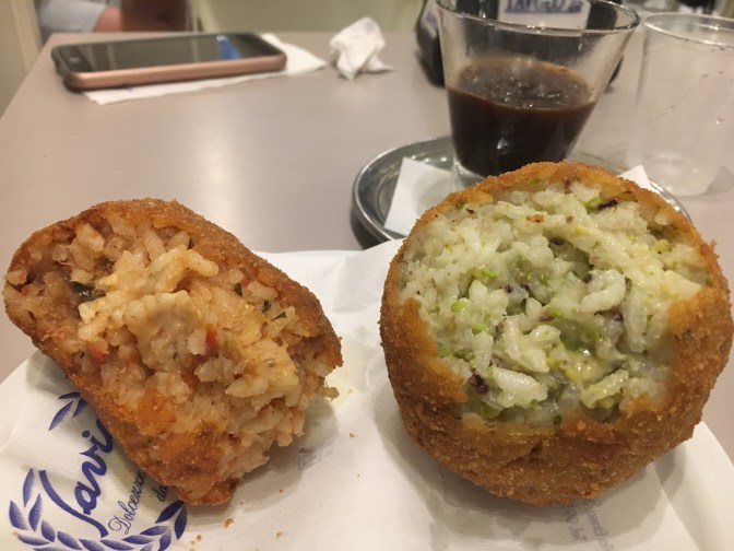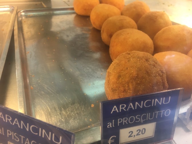After a long day of travel, we arrived in the port city of Catania. This is not a picture perfect city; it has a gritty working vibe. The overcast skies hid a view of Mt. Etna and did not highlight the few buildings of historic note. We did, however, find a terrific trattoria and tried both a catanese (potato and mozzarella) and a pistachio arancinu, (deep fried rice balls the size of softballs). They are served warm and you do not use utensils to eat them. Our drink, a cafe freddo, was like an espresso Italian ice and it was delicious, too. Unfortunately, this left no room for cannoli.