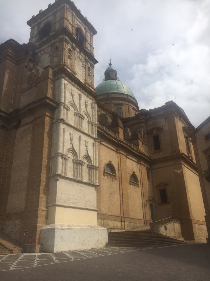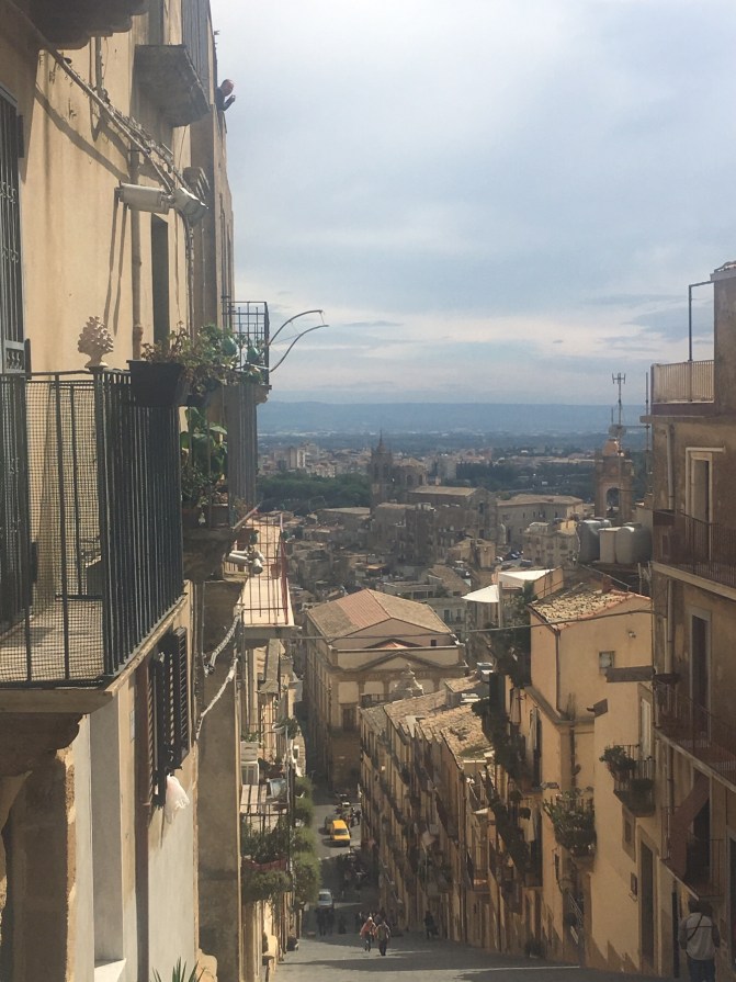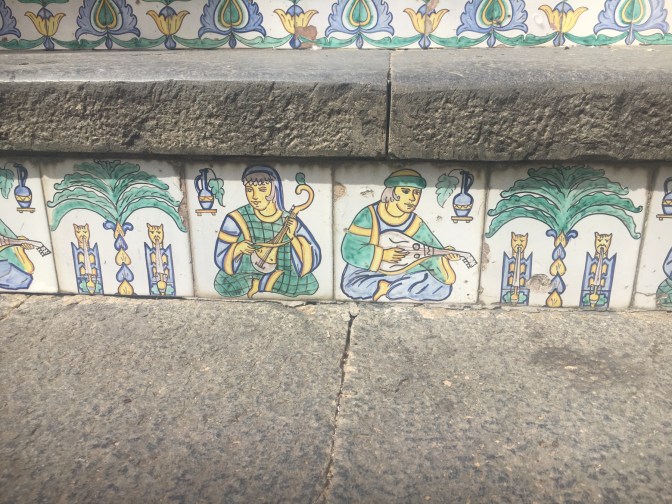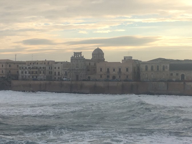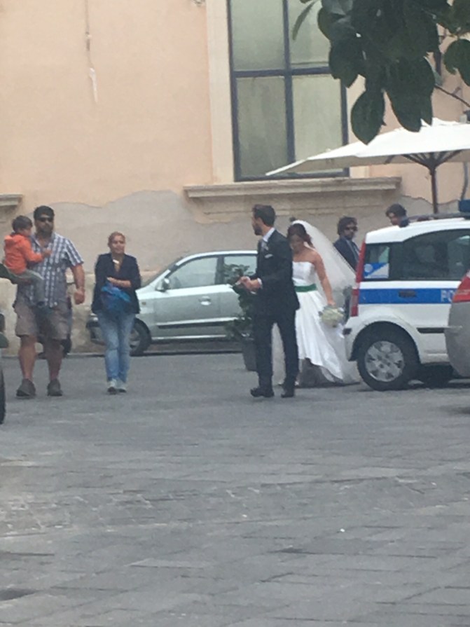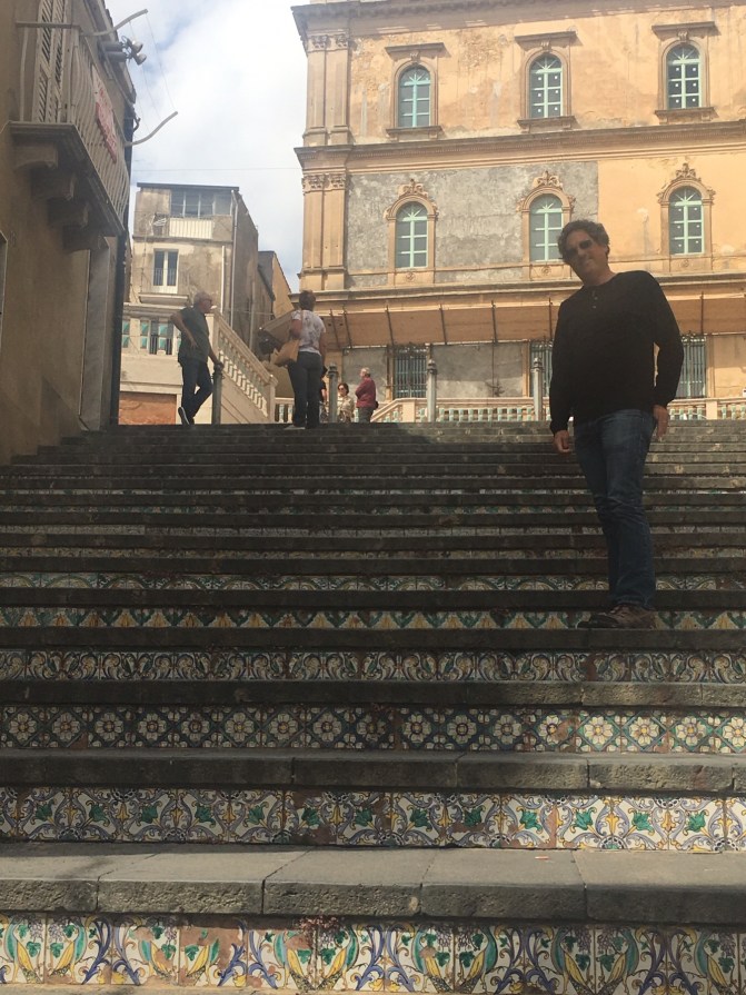 The impressive Villa is near the center of Sicily and was discovered/uncovered in the 1930s. Built in the early part of the fourth century, the mosaics are astonishing and the villa is sprawling. Each room’s floor is decorated with scenes and intricate patterns. A central mosaic runs the length of the main hallway, about 60 meters, and depicts the capture of wild animals and their journey by ship to Rome. Another well-preserved floor shows women participating in sports wearing bikini-style athletic clothing, as beach volleyball players currently wear. The original intensity of the colors must have been remarkable considering that even faded, they are spectacular.A medieval town located near the Villa is Piazza Armerina. We took a detour to drive up the winding mountain road to see the town which was settled/conquered by the Catalán from Spain. There is a statue of a conquistador outside the cathedral and a church on every corner. The location is what is most special. It is at the top of a mountain and overlooks the surrounding valleys.As we entered the town of Caltagirone, famed for the ceramic tiled 142-step staircase, we stopped first at a family-run ceramic studio. We met four generations of tile makers and painters. We were given a tour of the facility and spent a little time chatting with the artist-sons who carry on the family tradition. The Caltagirone style uses only three colors of glazes; yellow, green and blue. The sons have broken with tradition and now use many more glazes in their works.It was time to see the extraordinary tiled staircase. There really are 142 steps. From the bottom, it just looks like a very long staircase, nothing exciting. However, as you approach, the tile faces are clear, each step is long and deeper than feels normal. Most incredibly, each of the steps offer a completely different set of tile designs with no repeats. Along the walk up there are ceramic shops, a few galleries and some snack places, too. At the top is the Santa Marina del Monte Church(m (it was closed) and an impressive view of the town.Caltagirone is beautiful with tiles and ceramics everywhere. We headed back down and enjoyed some iced cappuccinos before heading to our final destination of the day.The waves were crashing against the sea wall as we entered Siracusa-Ortigia. The island side of Siracusa is charming. We walked around the pedestrian area and we caught a glimpse of a wedding. We stopped to people watch at the Duomo piazza, we sipped beverages and recapped our day one mosaic piece at a time.