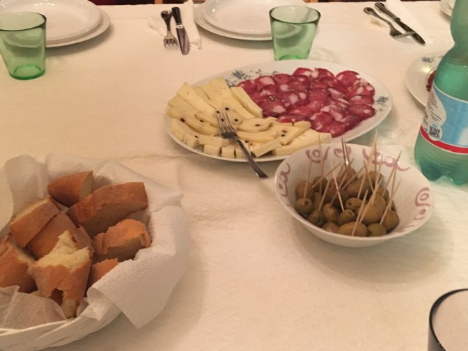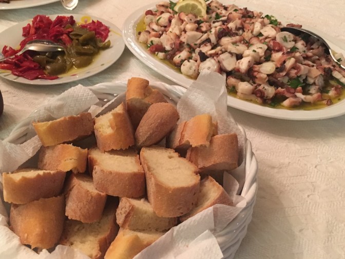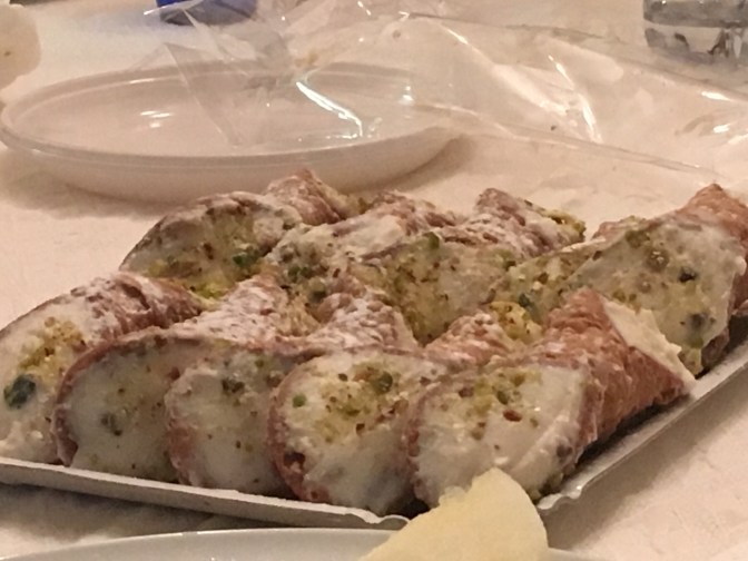 When it rains we find solace in food and beverages. Lucky for us, the family of our friends welcome visitors with open arms and delicious food. We traveled to the small fishing village of Roccalumera, halfway between Taormina and Messina. The Italian mainland region of Calabria was visible across the straits of Messina, like New Jersey across the Hudson River from New York. Our greeting was filled with love and amazing aromas from the kitchen. Risotto with porcini mushrooms (that were foraged earlier in the day), Stocco stew, a delicious traditional cod dish, pulpo, caponata, stuffed anchovies and so much more. Coupled with homemade wine and finished with gelato, pistachio-filled cannoli, a plate of fresh melon and a dish of persimmons. The language of food, and lots of pantomime along with the family’s pretty good English (compared to our pretty rough Italian) made this special evening extraordinary.