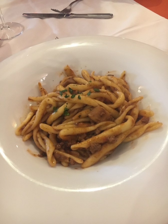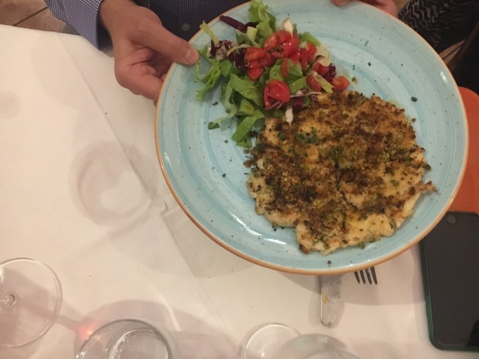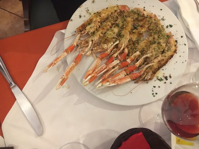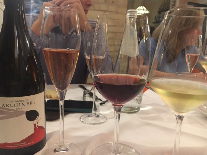 With more friends arriving, a proper meal at a restaurant in Taormina was arranged at Osteria Nero D’Avola. Each dish was beautiful, tasty and had clever names. The octopus dish was called Pulpo Fiction. It was prepared in the three-legged shape which is the symbol of Sicily with a little berry splatter. We toasted with a blush sparkling wine and had an Etna Rosso and a nice crisp white, too.