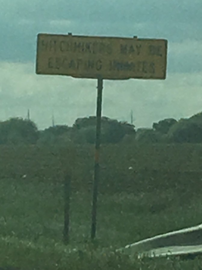The back roads are scenic and vast. As we pass the occasional town, we also pass some interesting road signs.