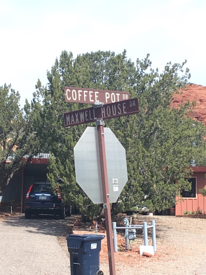 Coffee Pot Trail seemed like the appropriate morning hike. We got to the trail head close to the corner of Maxwell House and Coffee Pot Lane, of course. The hike was beautiful and shoots off to several other trails. We were inspired to actually get coffee. We ate at Etch, which is along the edge of the bubbling Oak Creek. Another stunning view of Sedona.