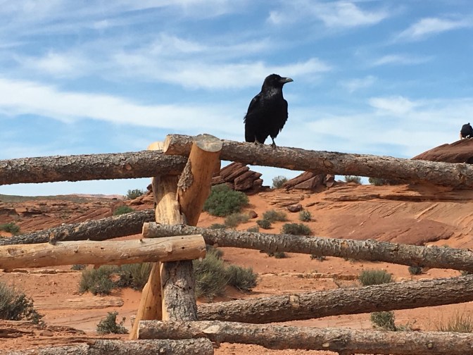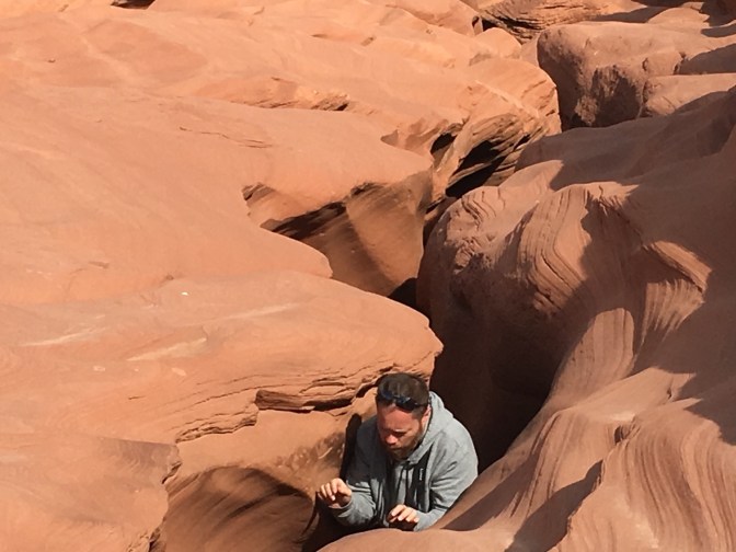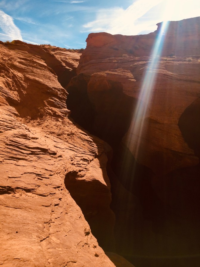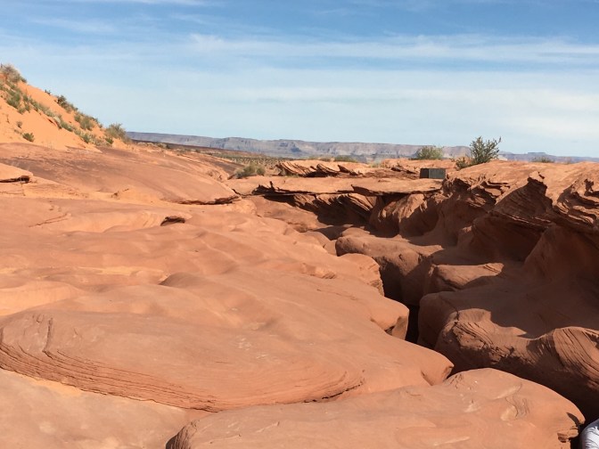 Antelope Canyon is located on Navajo Nation land and it is considered to be sacred. The canyon is divided into an upper and lower sections. We toured the lower canyon. The lower Antelope Canyon is a half mile long and 120 feet deep. A Navajo guided tour is the only way to visit the canyon. Our tour lasted about an hour and it was breathtaking. Each section revealed more beautiful eroded sandstone colored by the sun.Our guide took our camera, had us pose and instructed us to run behind her and stop on the opposite side of the small room; she had used the panoramic function on the phone:Exiting the canyon, the ground does not reveal the beauty hidden below.Only 10 miles from Antelope Canyon, Horseshoe Bend is not located on Navajo land. The National Park service uses an image of horseshoe bend as its symbol for Glen Canyon. Horseshoe Bend is a 270-degree horseshoe-shaped bend in the Colorado River.