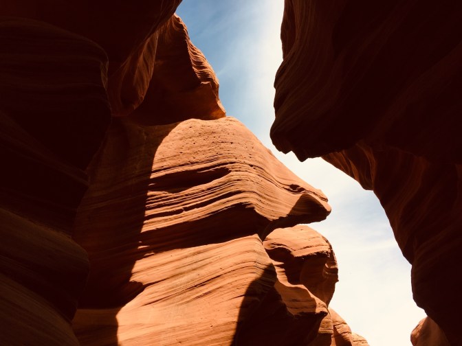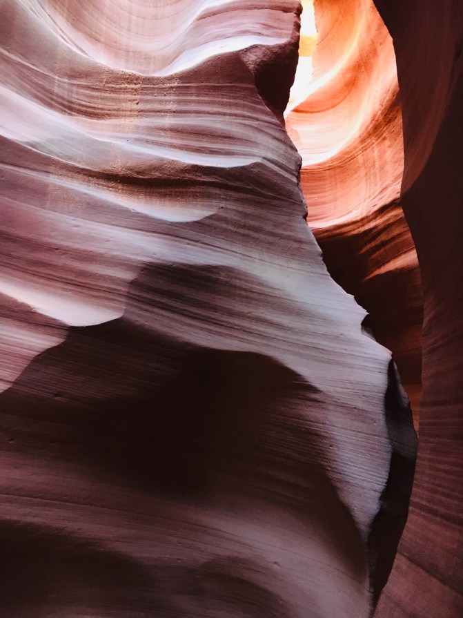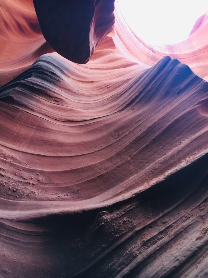 Antelope Canyon is a slot canyon, created by water rushing through the sandstone during flash floods. The water carves a winding path through the stone, forming round and waving walls marked with delicate lines. Unlike the Grand Canyon, which is extremely wide (18 miles), a slot canyon is much deeper than it is wide.