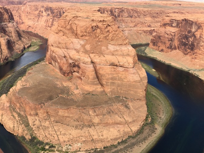It is a short hike on sandy ground to reach the view of the hidden bend and it is pretty cool.It is possible to boat around the Bend and to walk on the center rock…but not from the location we entered.