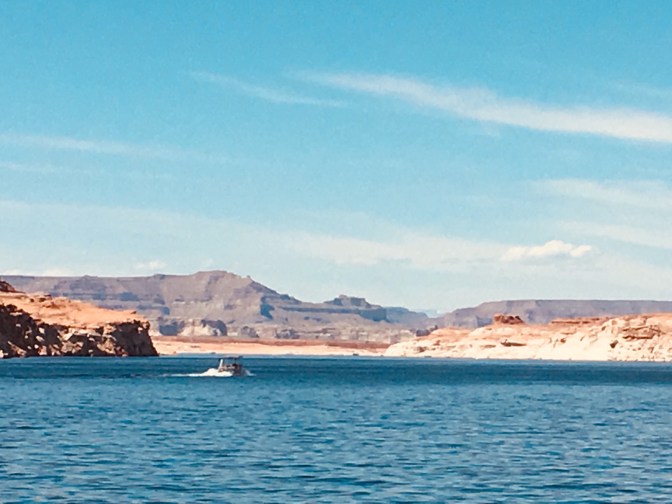 Lake Powell was created as a reservoir for the southwest with a dam of the Colorado River in Page, AZ. It holds enough water to supply Phoenix, San Diego and Los Angeles through drought conditions. Before the dam was built, more than 500 feet of Glen Canyon was exposed, now, less 200 feet of canyon walls are visible. Our excursion took us through Antelope Canyons narrow serpentine for several miles. This would eventually lead to the slot canyon we toured earlier. We also passed through more winding waters of the Navajo Canyon where the walls tower 600 feet above the water. The walls of Navajo Sandstone are mostly red and burnt orange rocks. The rocks are striped with black manganese and other minerals leaving unique designs. It is also called desert varnish or Navajo Tapestry. There are lots of water activities and an incredible amount of house boats for rent. Though not usually mentioned in lists of amazing National Parks, the unique beauty found here makes this a ‘must see’.