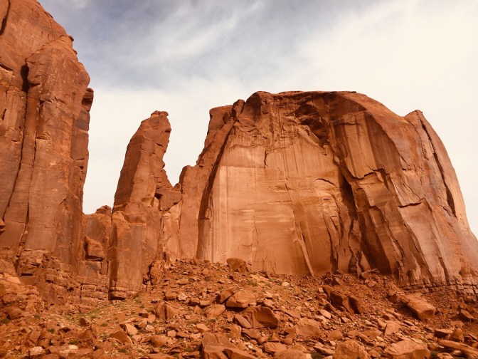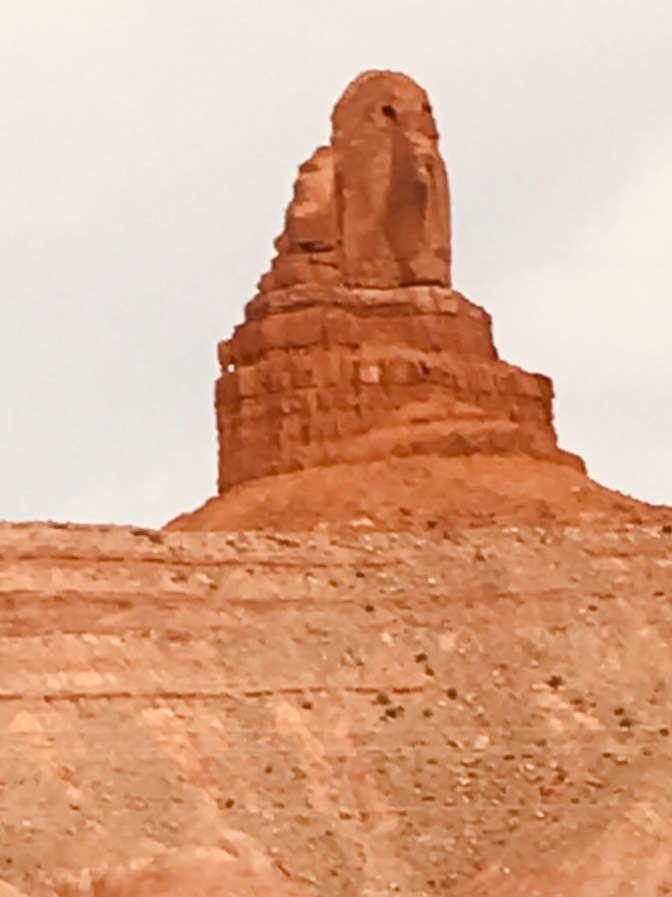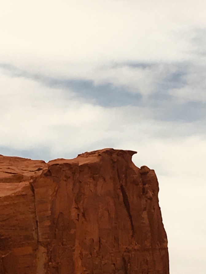 We arrived at Oljato-Monument Valley (the official Navajo name) early, but after sunrise. The sun was unsuccessfully trying to break through the clouds leaving the usually red colored monuments a bit flat. This area was made famous as the backdrop of countless Western movies, many starring John Wayne. The park places you in the middle of a wonderland of spires, buttes and red rock creations. The majestic valley is accented with the clouds and sun casting shadows on the 400-1,000 foot tower formations of fragile sandstone. The scenery is vast and wonderful.