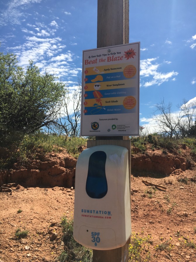 There are over 30 miles of multi-use trails. The hiking trails are often shared with the mountain bikers but not the horses. We explored trails along the water, through the trees and around hoodoos. A nice touch by the park and local sponsors are the sunscreen stations at each of the trail heads.