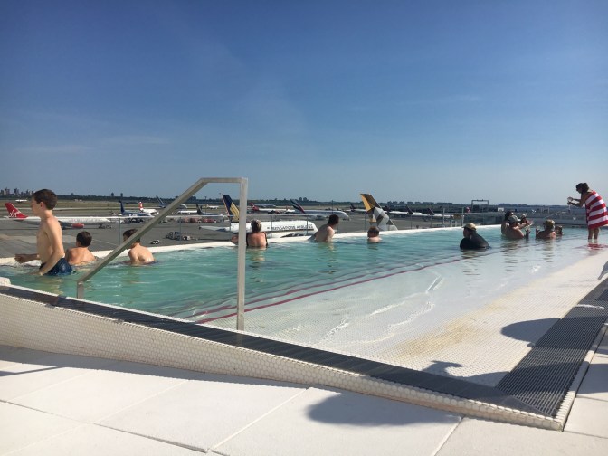 The original tube walkways have been carpeted in TWA red. One leads to hotel rooms and a rooftop infinity pool and pool bar, the other to Terminal 5. The rooftop has outstanding views of the Manhattan skyline, Queens and of course, departing flights. There are fun drinks at the bar, one which includes a TWA wing pin.