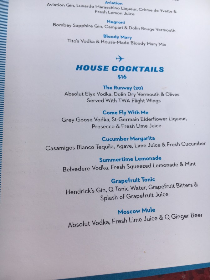 We entered the hotel from the ground floor where popular tunes from the ’60s and ’70s played over the sound system, several vintage cars were on display, and the stairs leading to the lounge were inviting us to a time when international plane travel was glamorous. Some original seating remains in the penny-tiled lobby where guests are checked in at flight counters by employees dressed in vintage TWA uniforms underneath the still functioning oval-shaped departure and arrival board. Adding to the charm and ambiance are David Klein destination posters, and a Vulcain clock which is suspended above the sunken first class cocktail lounge. Outside the windows there is a view of “Connie” a Lockheed Constellation airplane, restored and functioning as another cocktail lounge.