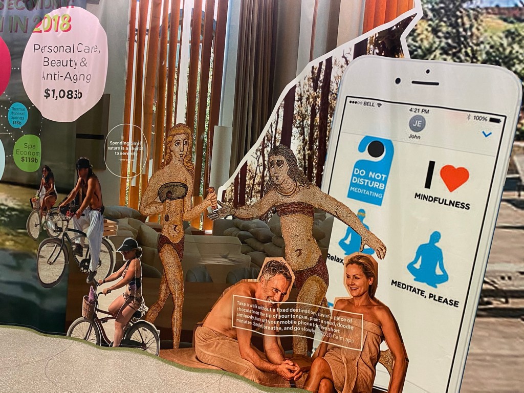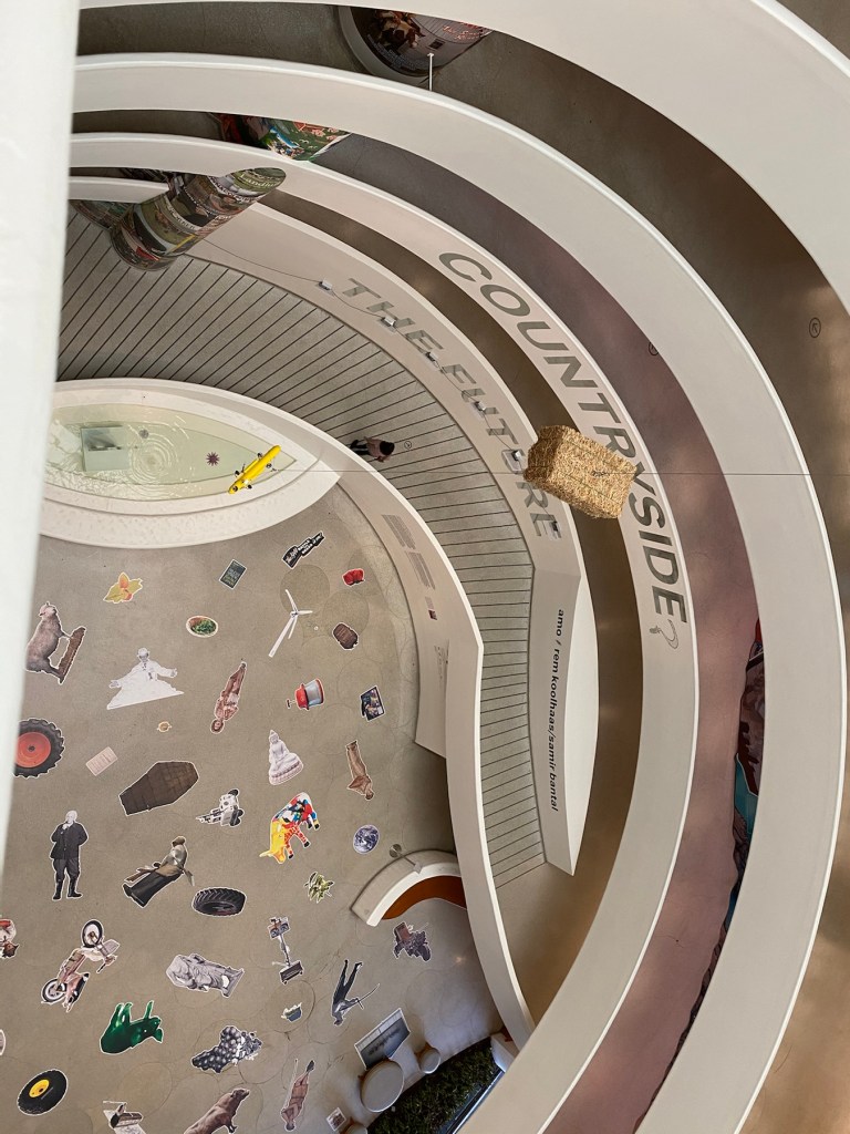 The largest exhibit covering every surface of the rotunda and tower is titled: Countryside, the Future. It is a group effort lead by the architect Rem Koolhaas. The show explains that only 2% of the earth’s surface is considered city. Each turn of the ramp addresses the countryside in terms of changes in ecosystems, migration, leisure and other issues that alter landscapes across the world.