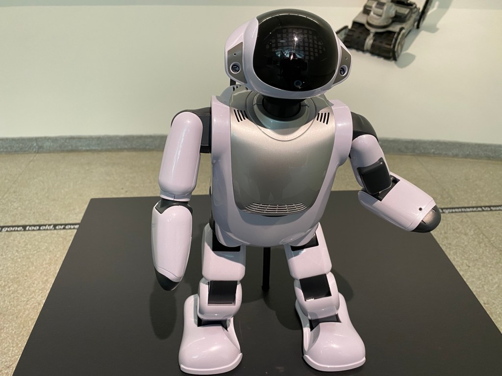 The ceilings, walkways and floors are covered in phrases that draw your attention to the many screens, robots and collages.