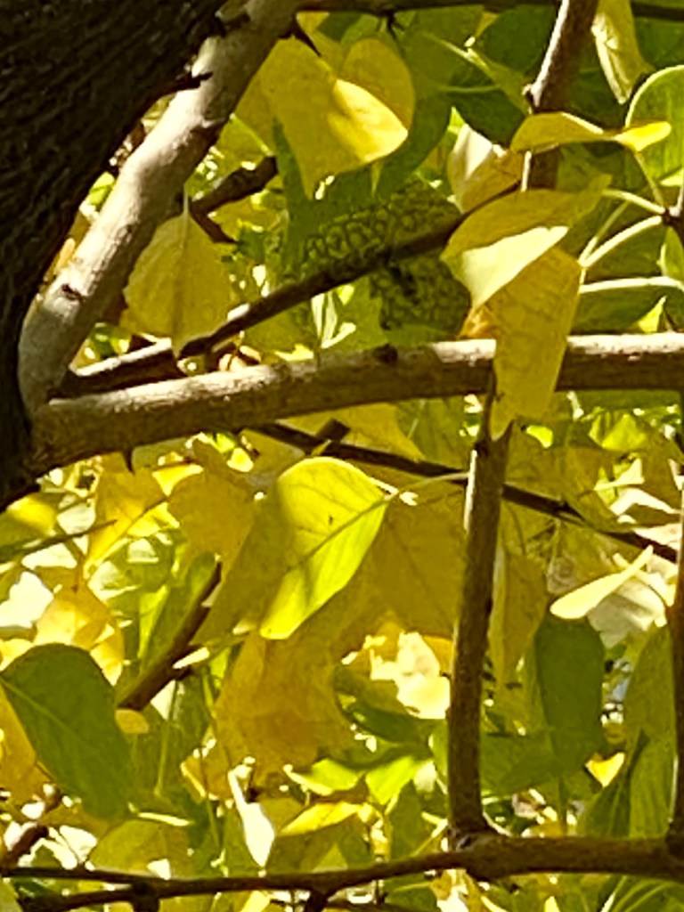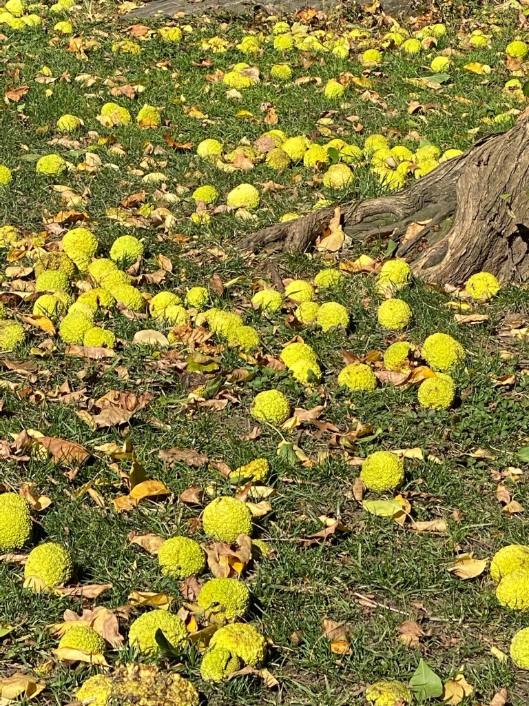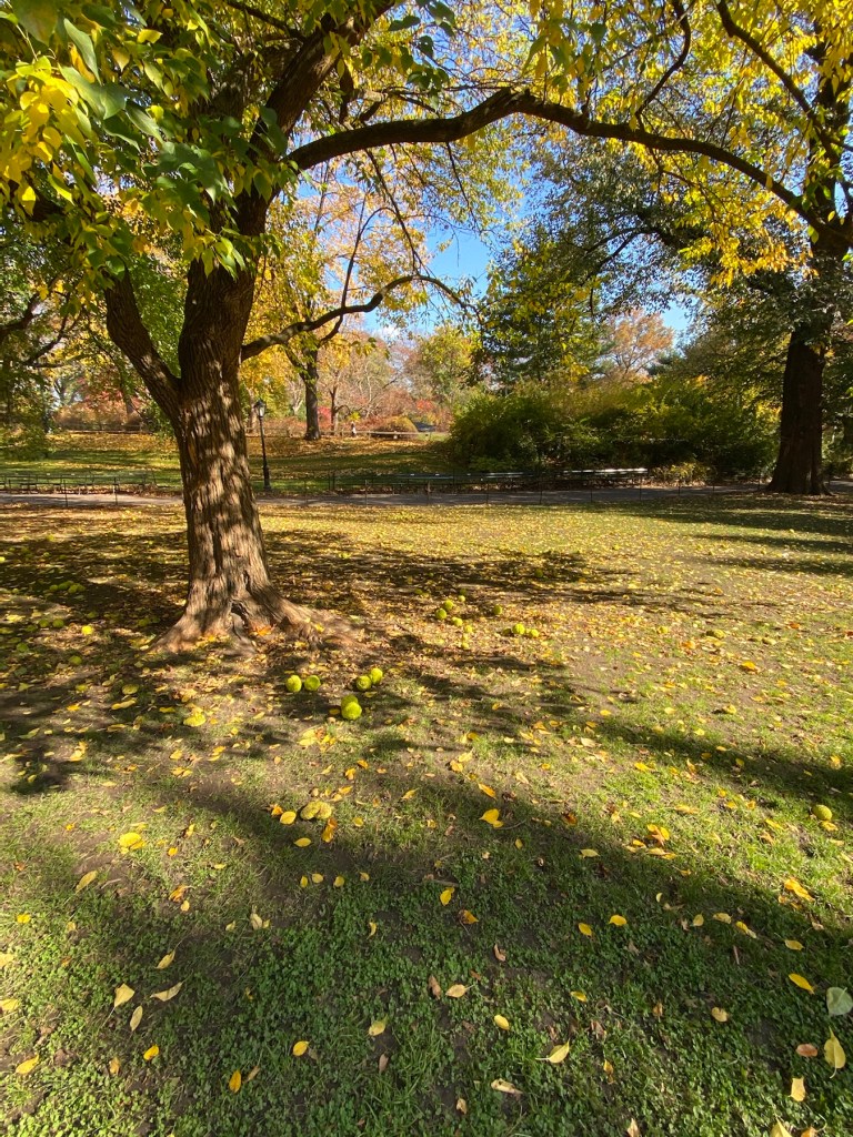 Near 72nd Street, just off the bridal path, the trees shed giant yellow balls, some bigger than grapefruits. They can be smooshed, and they have enough weight that you would not want one falling on your head. These trees have been in the park for many years, but this is the first time I noticed and paid attention to them. Maybe it’s the background music from the Ellen Reid Soundwalk app that brought them into my line of sight.