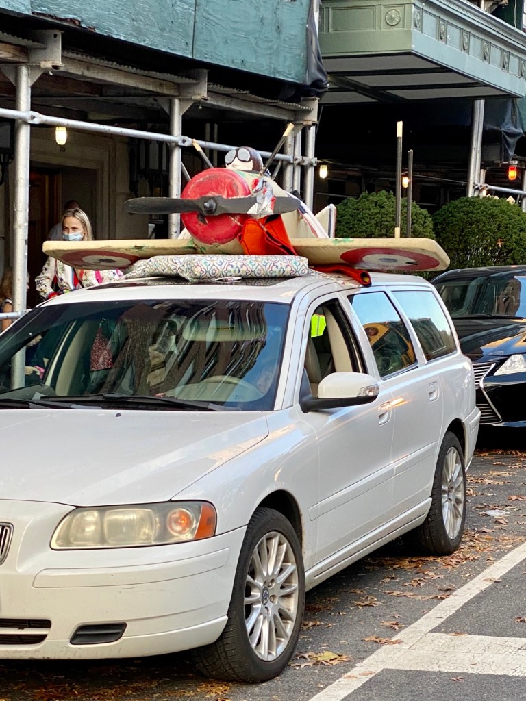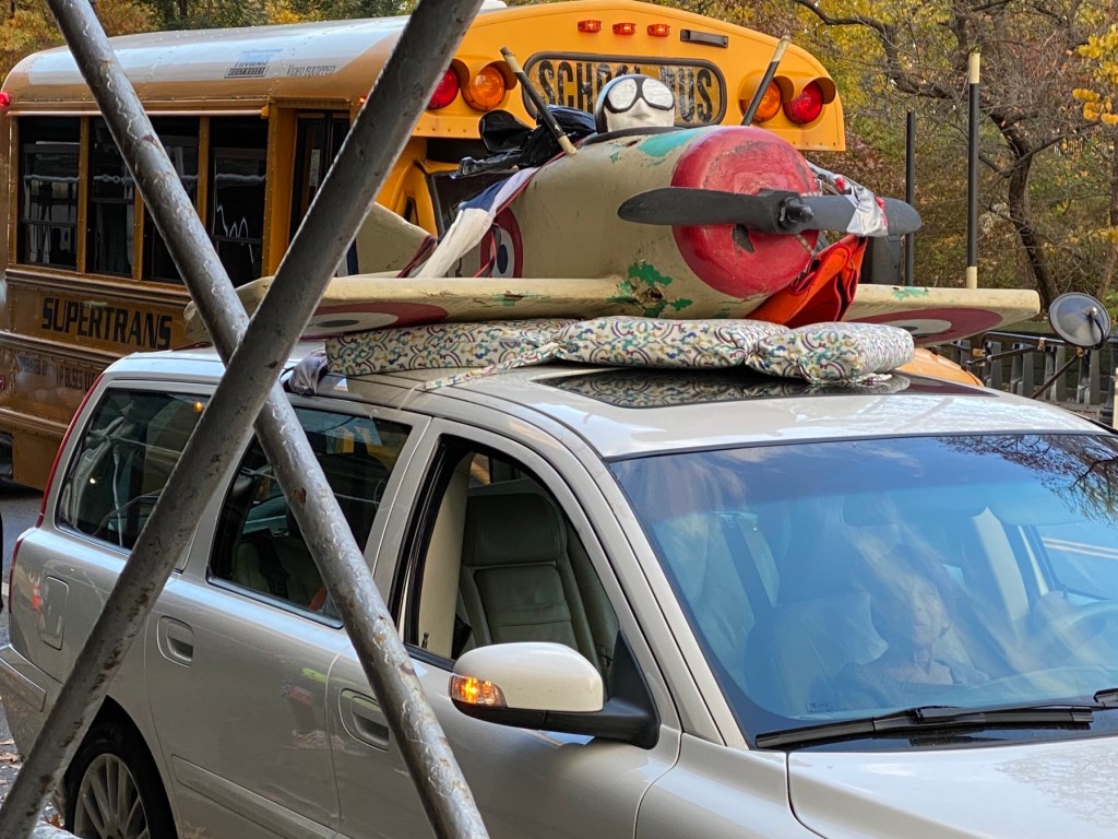 As I exited the park, not accepting a horse and carriage ride or a pedi-cab ride, I noticed a plane atop a car and also the bead light wrapping of the trees for the winter. It is the small goofy things that put a huge smile on my masked face.