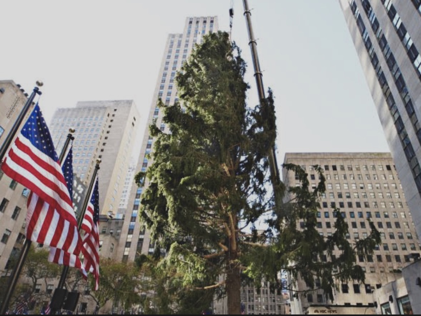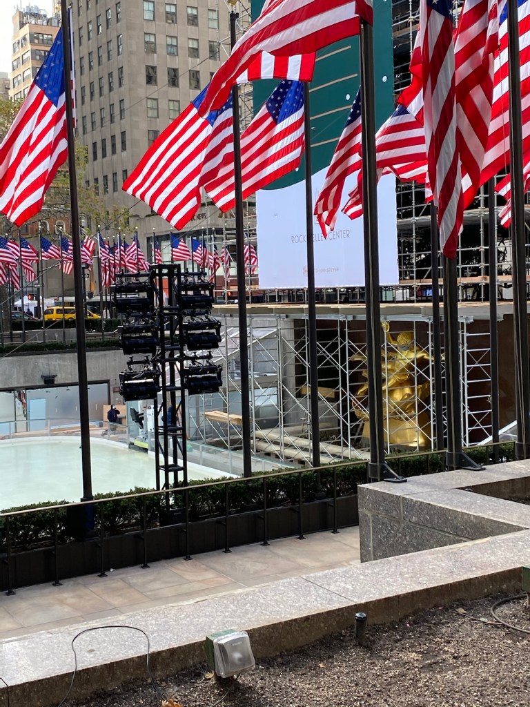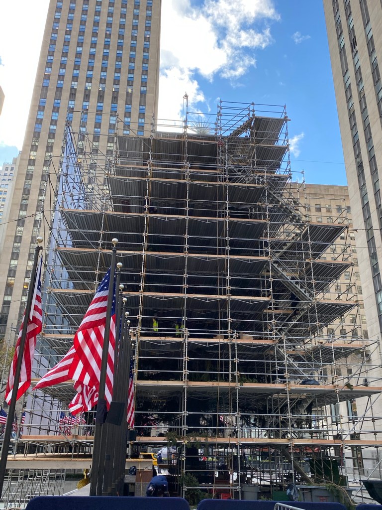 This year’s Rockefeller Center Christmas tree is already referred to as a Charlie Brown tree. The tree looks like it is missing bunches of limbs. Typically, after the tree is placed in front of 30 Rock, it is surrounded by scaffolding while the lights are strung and they prepare for the lighting. This year…that scaffolding has a solid front hiding it from the public. Lots of workers were busy stringing lights, saving an owl and possibly putting additional branches on the tree. The tree lighting takes place on Dec 2 this year. There will be a televised viewing, no public access this year.
