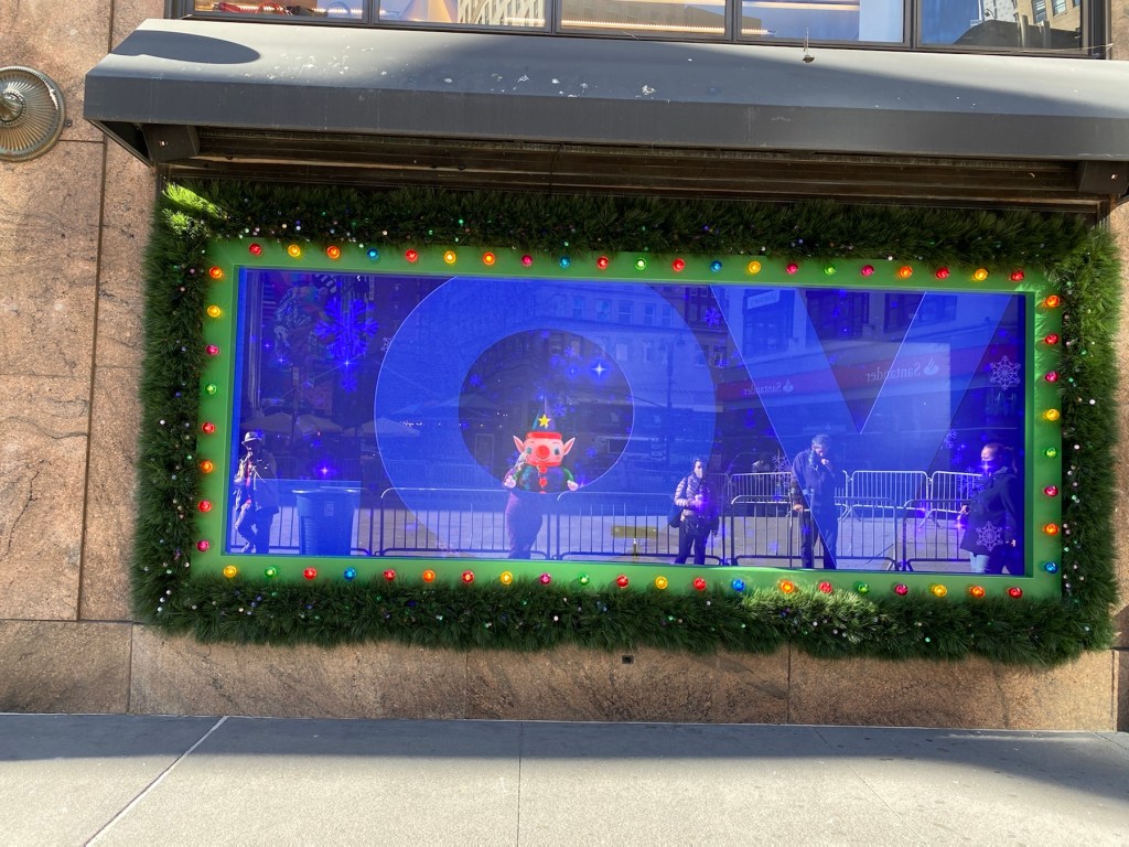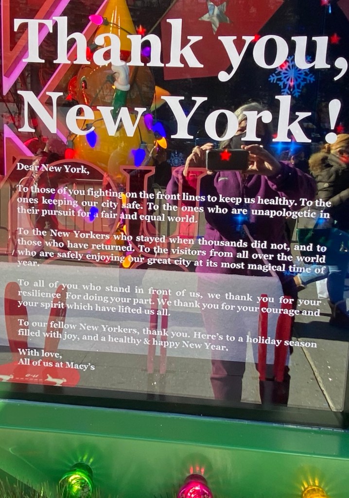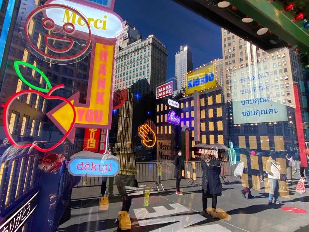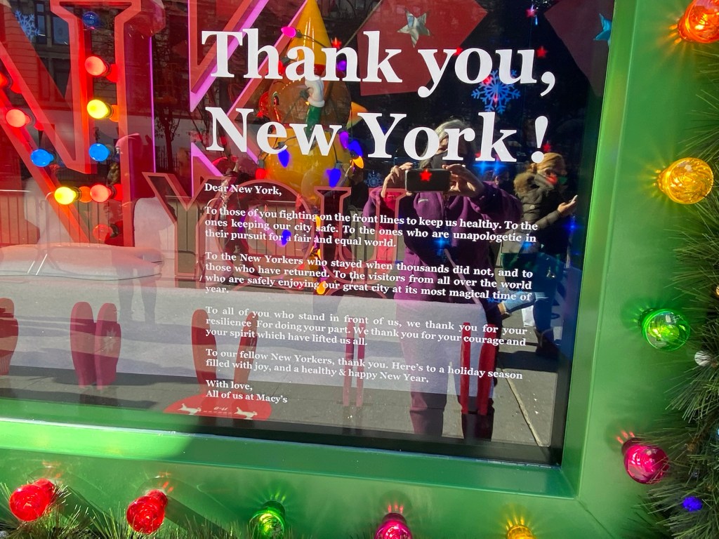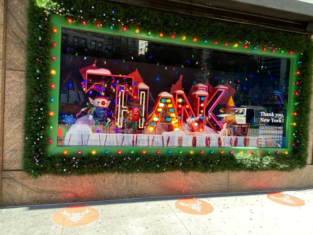Six blocks south, the world’s largest department store is Macy’s at Herald Square. Similar to Bergdorf’s, Macy’s holiday windows are a very shiny ‘thank you’ to New York. It is hard to get a flattering photo with all the shiny reflective surfaces, but I tried.