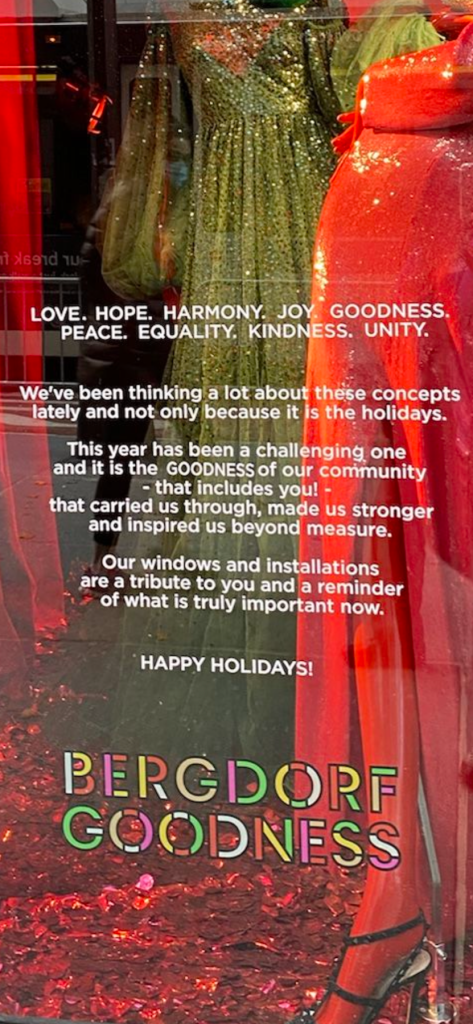 Bergdorf Goodman never disappoints with their windows at anytime of year and the winter holiday season is always special. 2020 has been an extraordinarily challenging year and Bergdorf’s theme of goodness is reflected in very shiny words. The reflection is to inspire and to remind us of what is truly important.