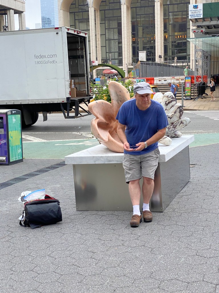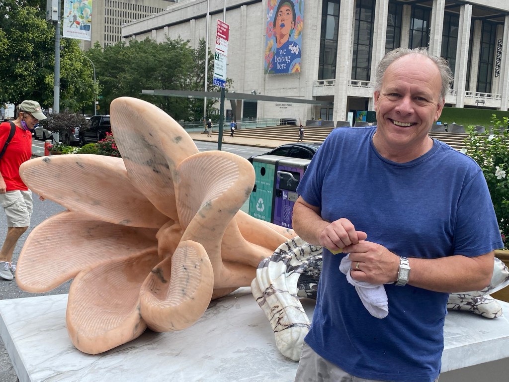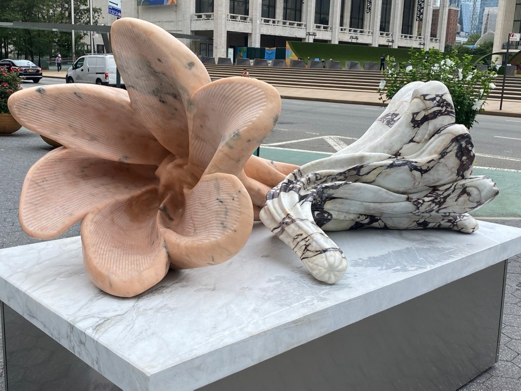 On a beautiful July morning across from Lincoln Center, in Dante Park, dividing Broadway and Columbus Avenue, a sculpture of two flowers appeared (after a night install). Lucky for us, the man who was closely surveying and wiping the pink marble flower confirmed he was the artist, Jon Isherwood https://www.jonisherwood.com/
