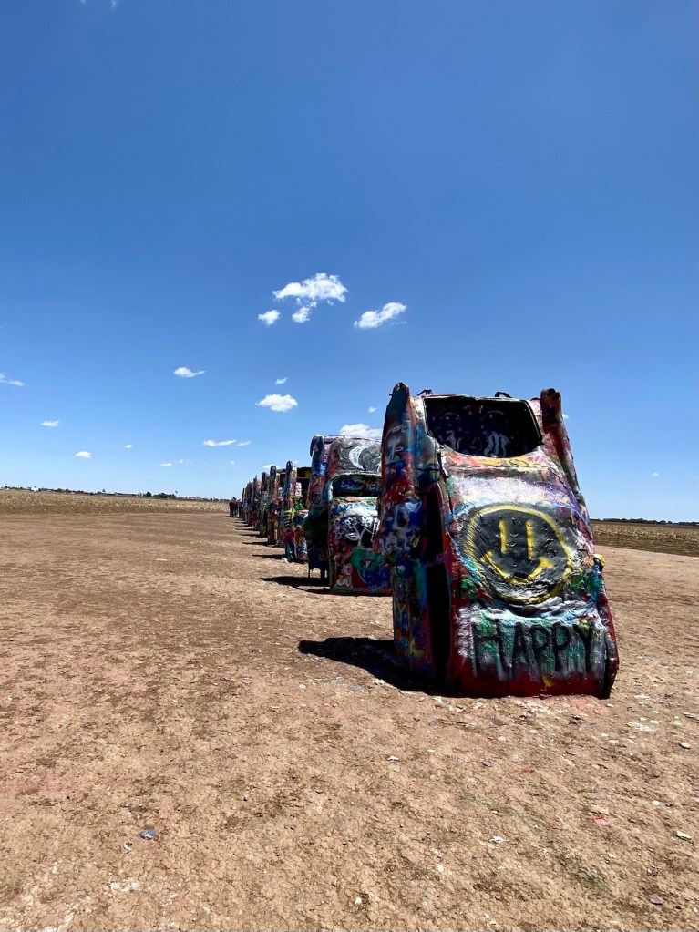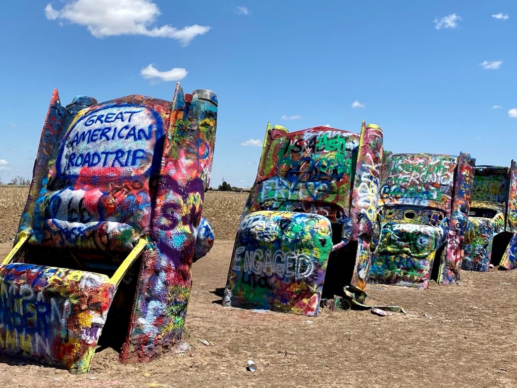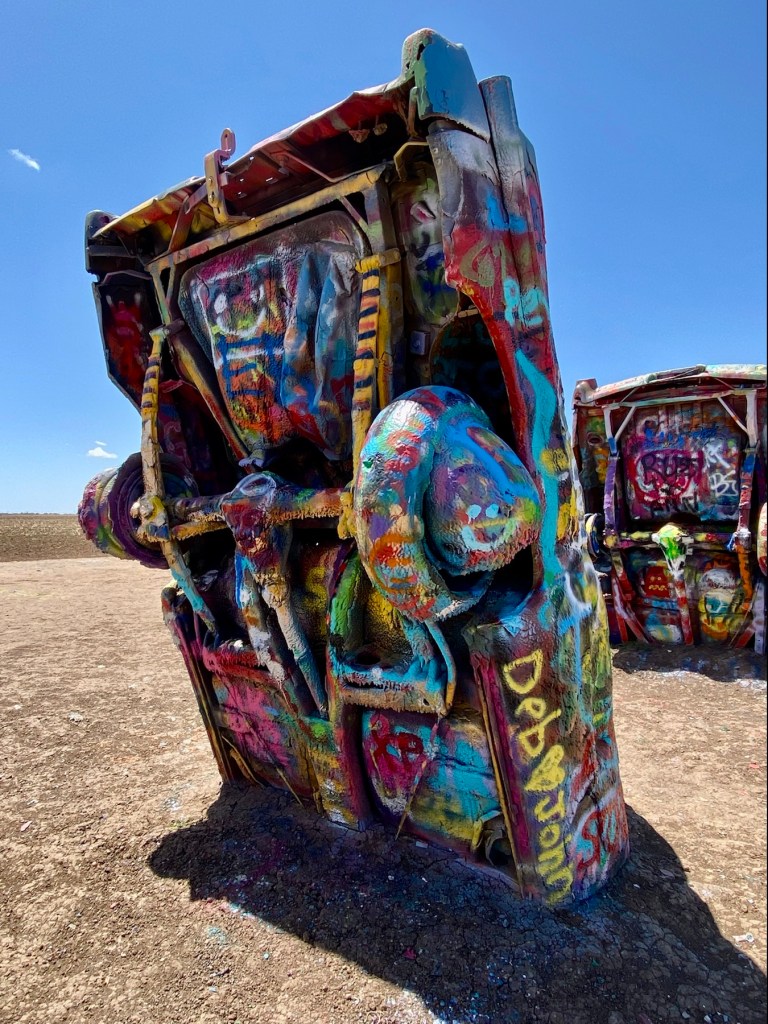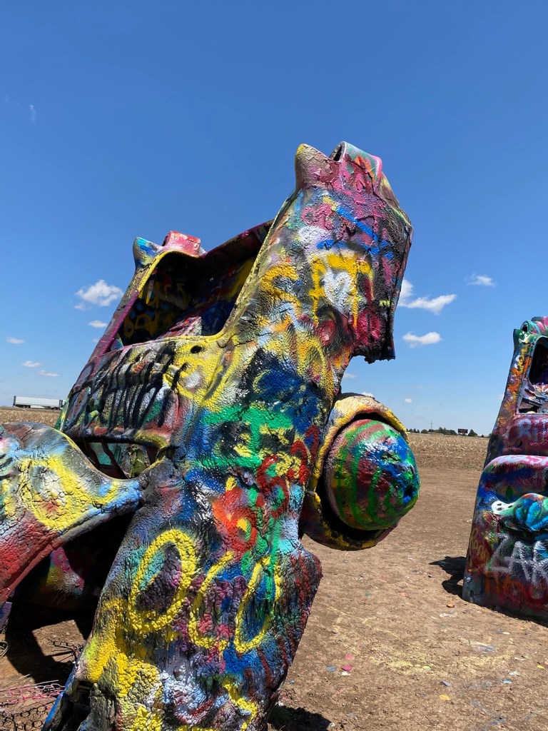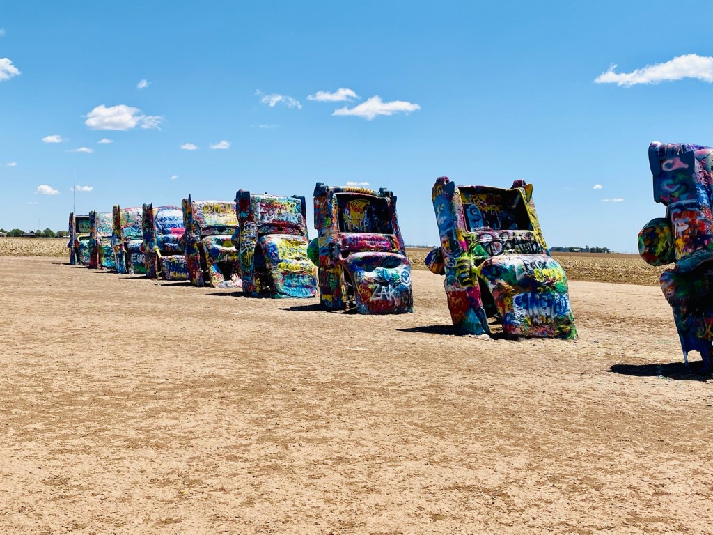 Texas is a massive state, fortunately, we crossed it at its narrowest section. Just off the highway near Amarillo is the Cadillac Ranch. This public art piece was created by a group of artists from San Francisco and bankrolled by Amarillo billionaire Stanley Marsh III. He wanted a piece of public art that would baffle the locals. A tribute to the evolution of the Cadillac tail fin, ten Cadillacs dating from 1949 to 1963 were driven into a field, then half-buried, nose-down, (supposedly at the same angle as the Great Pyramid of Giza). They face west in a line, for all to see. Today it is a huge tourist destination. The cars have lost their tail fins to vandalism and spray paint graffiti cover the cars. It is truly public art.