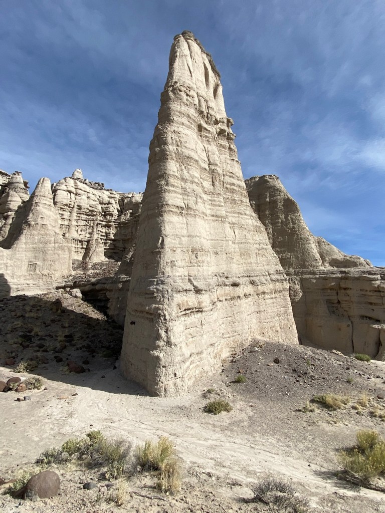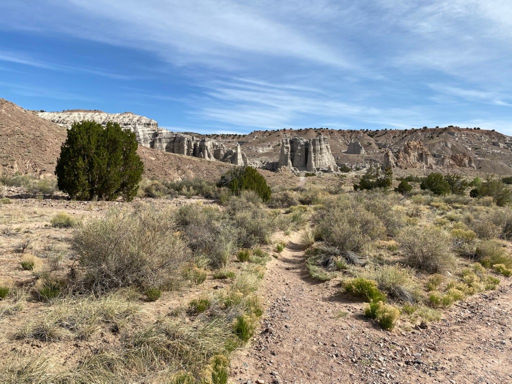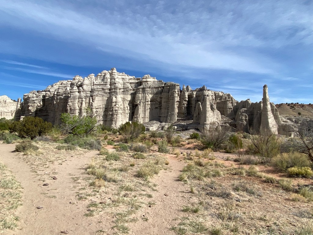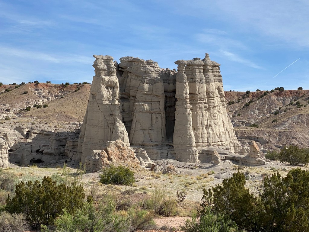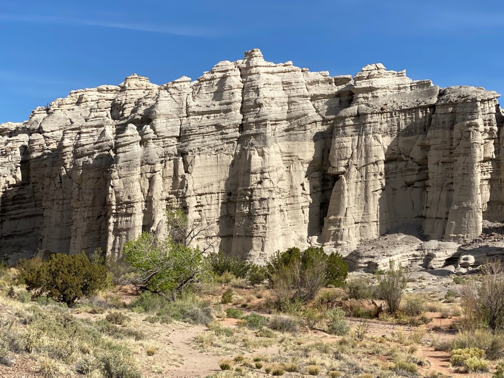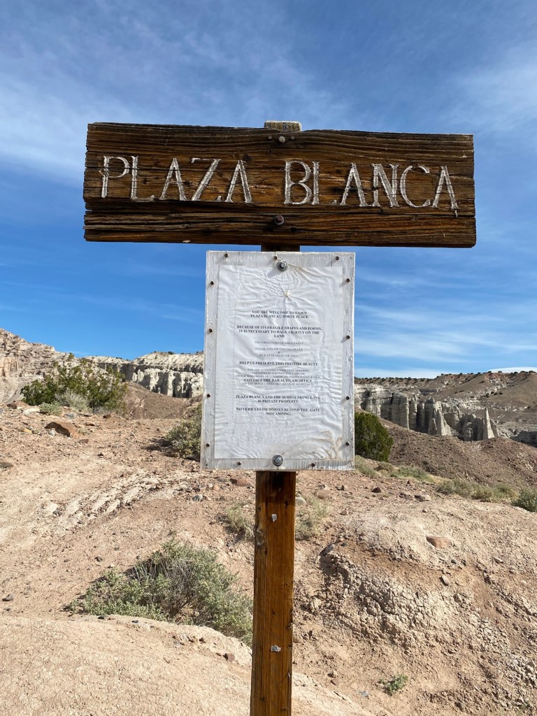 A morning hike at Plaza Blanca is a unique and spiritual experience. It is in an accessible but remote location where Georgia O’Keeffe returned often to paint and to camp. Dramatic white rock formations collide with a seemingly endless horizon and give Plaza Blanca its name, which is Spanish for the ‘white place’. The white rocks which have been cut by wind and water for centuries have an otherworldly terrain. The contrast of texture and light among the soaring rocks shift with the sun and clouds. It is easy to see the allure to capture their special quality in paintings and photographs. Plaza Blanca is on private land owned by the Dar Al Islam mosque and education center. The public, with pre-approved registration, has access to the area. We were all alone which made us feel big and small at the same time.