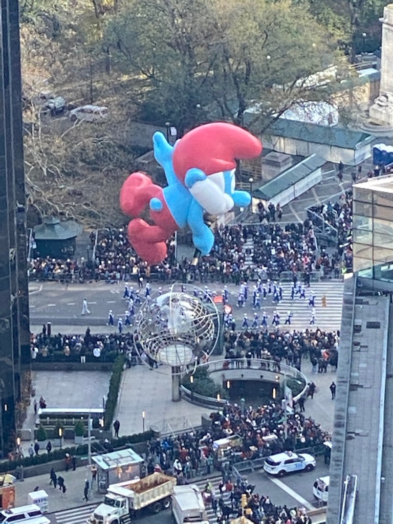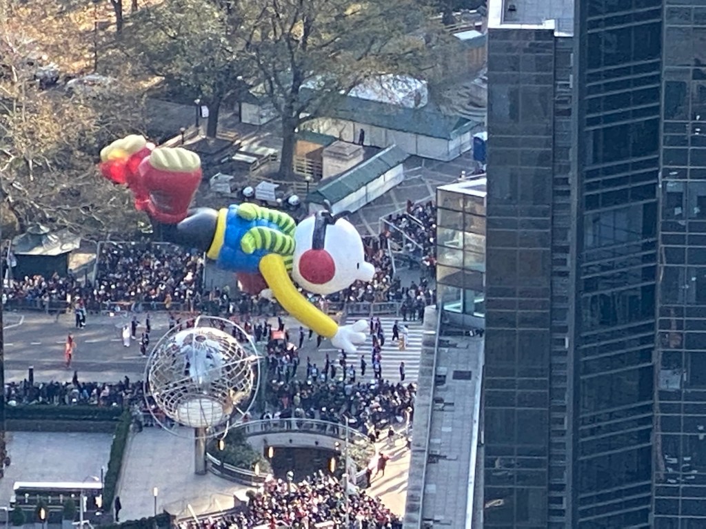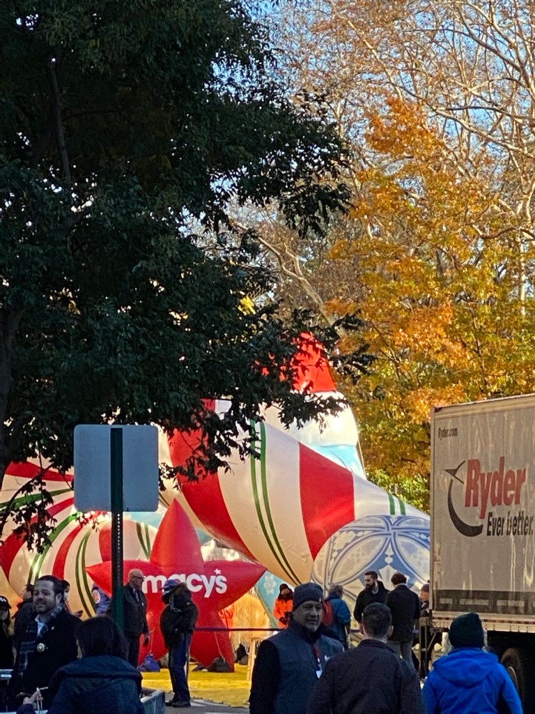 My lack of research kept me from the up close viewing of the inflation of the Thanksgiving Day Parade balloons, though I did get a photo of some candy canes and snowflake balls from across the street. However, my parade location presented me some over the top views of those same balloons.