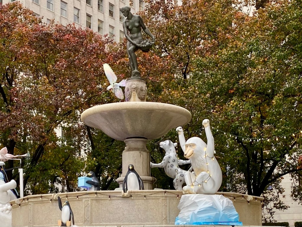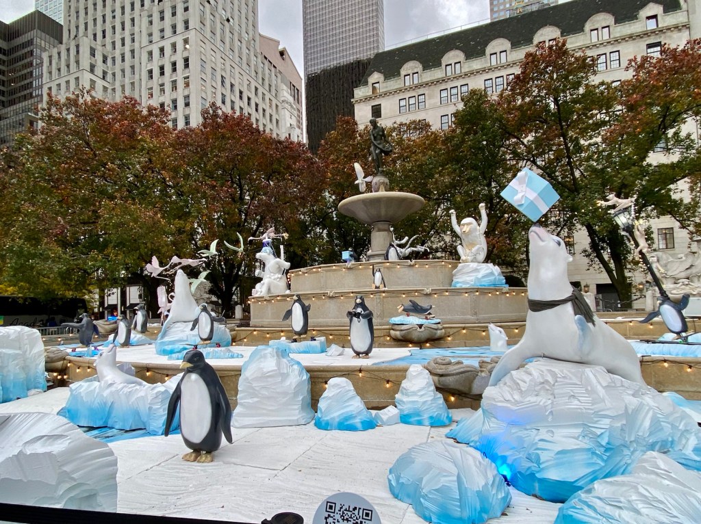 This year, instead of lighted trees in the fountain in front of the Plaza hotel, there is a North Pole display of winter animal fun. The penguins and the polar bears have cameras and yes, they are recording the crowds.