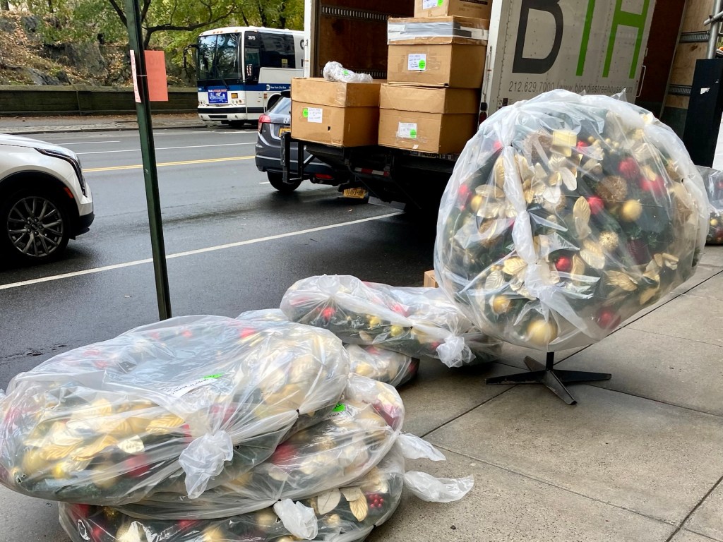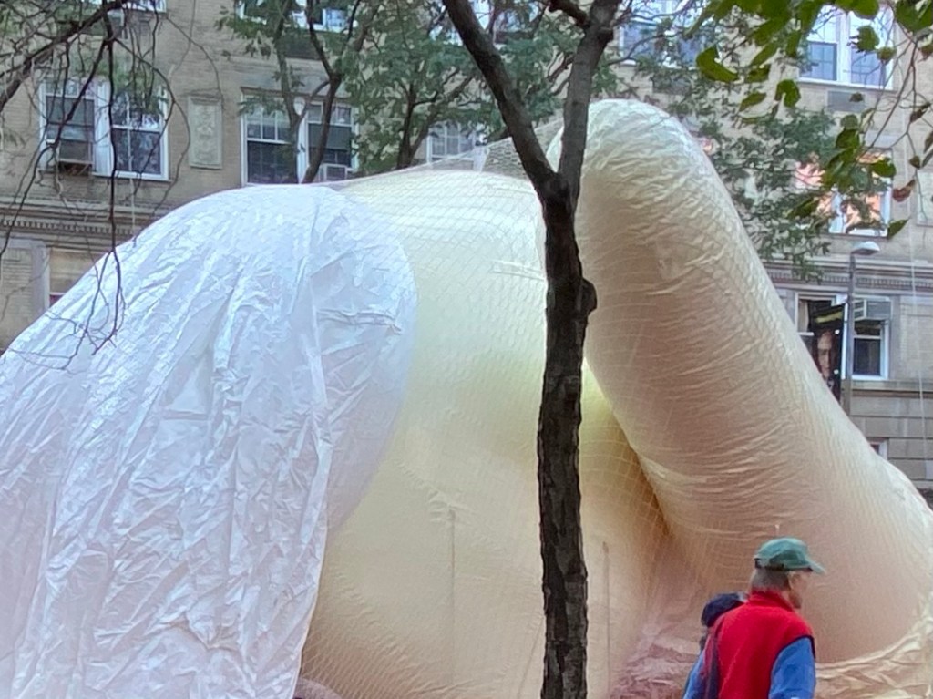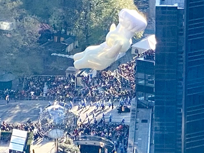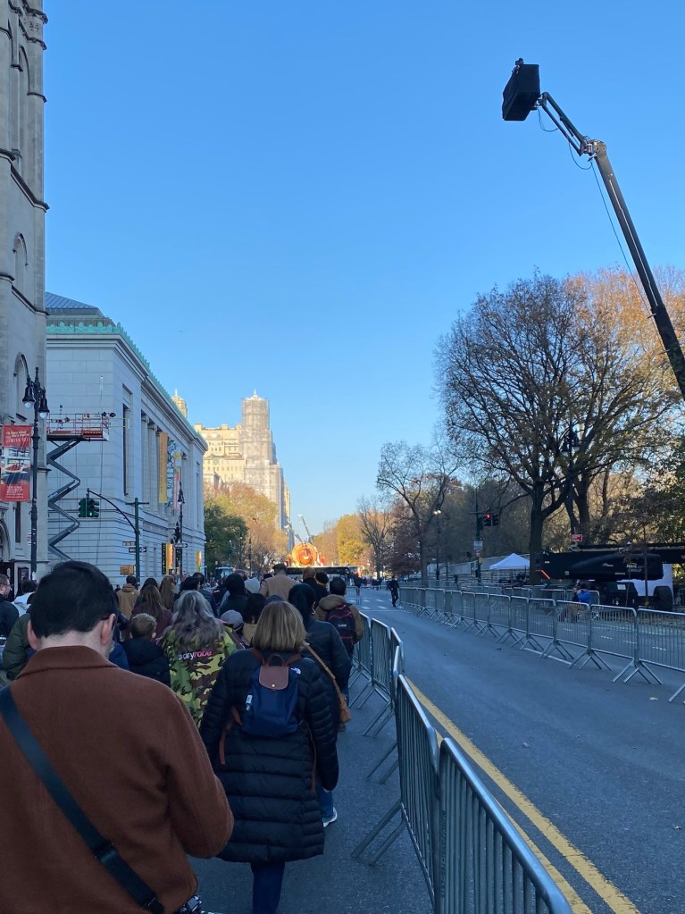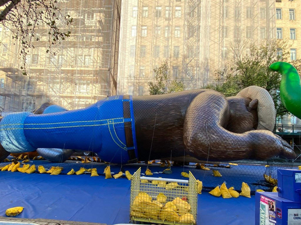 This time of year is filled with family rituals and traditions. My memories of the Thanksgiving parade ‘inflation party’ from years ago are of a much simpler and more organic nature. This year’s inflation was still a thrill, but there was nothing organic about long lines to enter through block-long barricades. We began on West 72nd Street and Columbus Avenue where we were screened before walking up a car m-free Central Park West. We noticed camera positions and viewing stands for the parade.