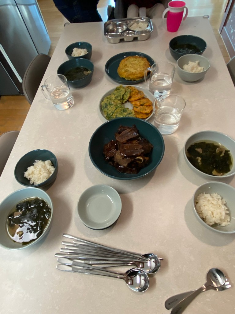 Enjoying a homemade meal which included 전 (Korean savory pancake), seaweed beef soup, rice, kimchi, various side dishes, and 갈비 (beef ribs).